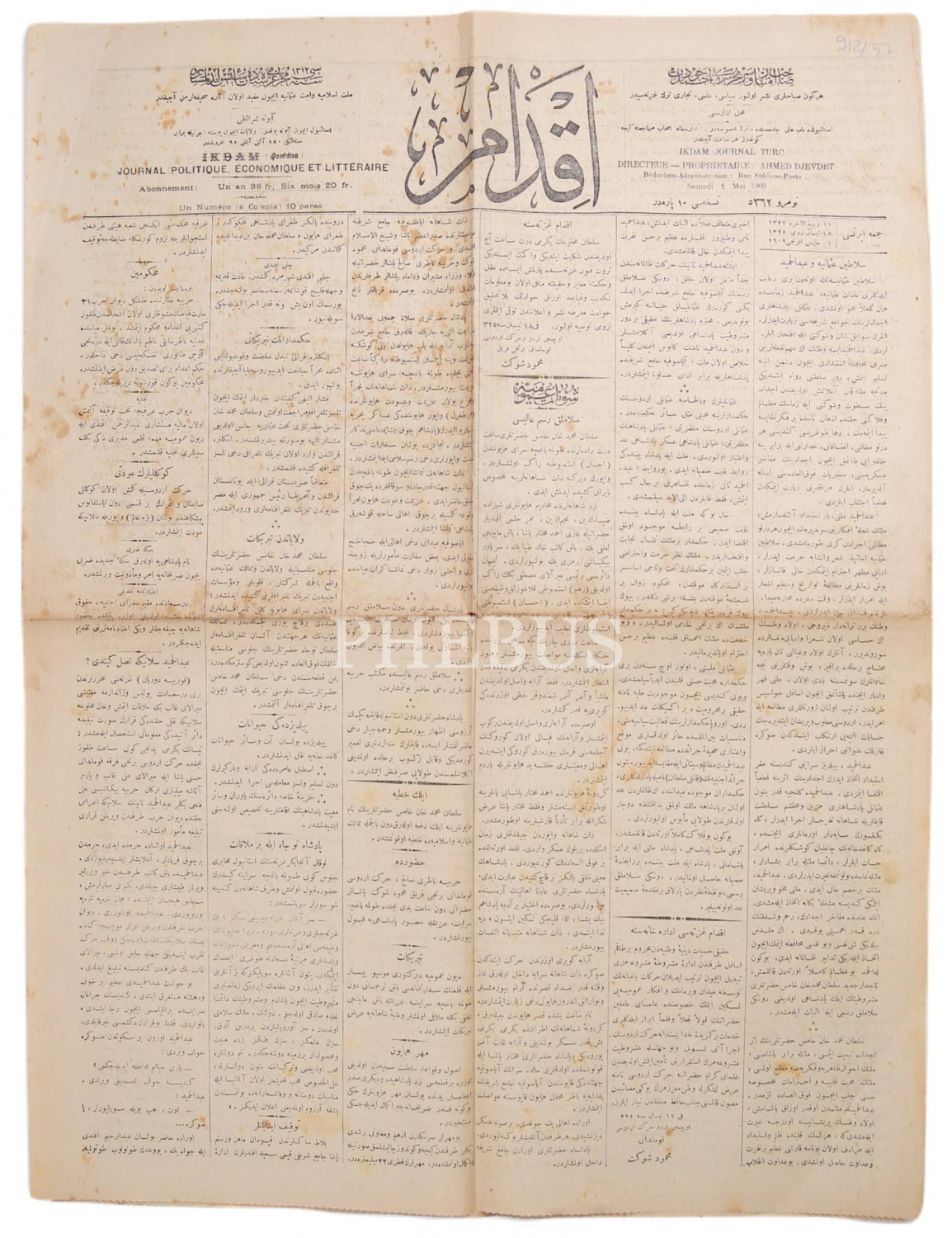 Osmanlıca İkdam gazetesi, Ahmet Cevdet, 1 Mayıs 1909, sayfalar ayrı, 4 sayfa, 44x60 cm