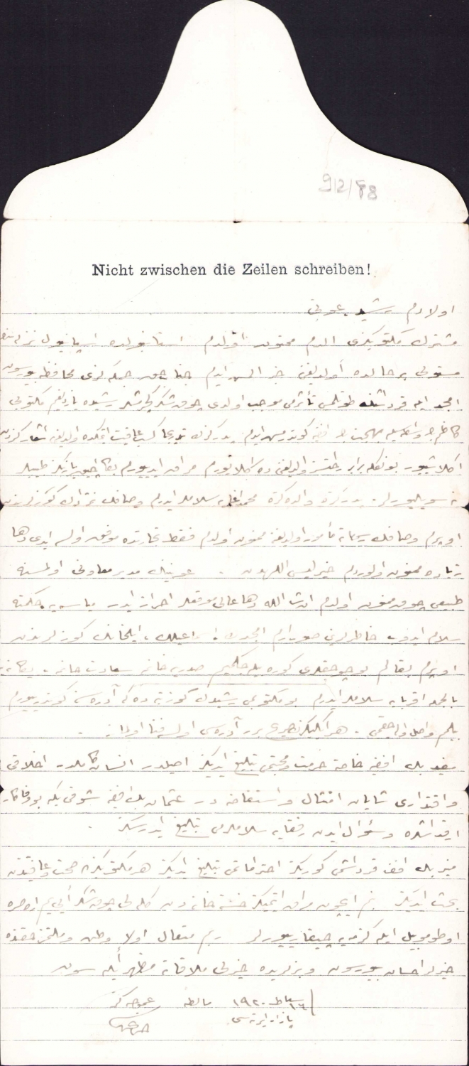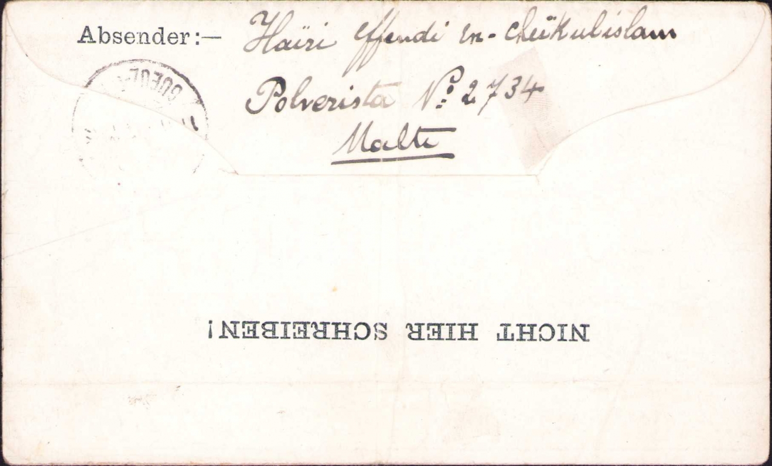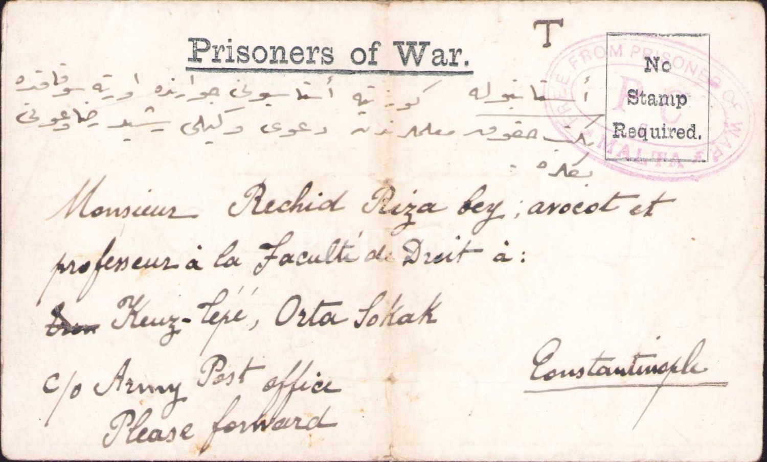 Malta sürgünü [Şeyhülislam] Hayri Ürgüplü tarafından dava vekili Reşit Rıza Bey'e gönderilmiş 16 Şubat 1920 tarihli Constantinople adresli mektup, 15x34 cm