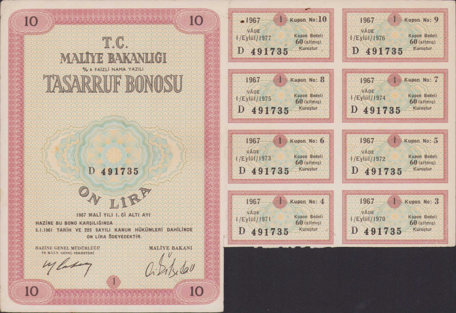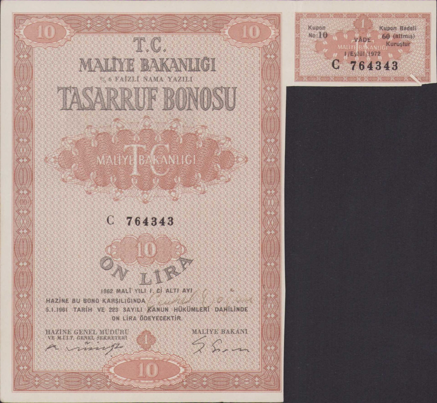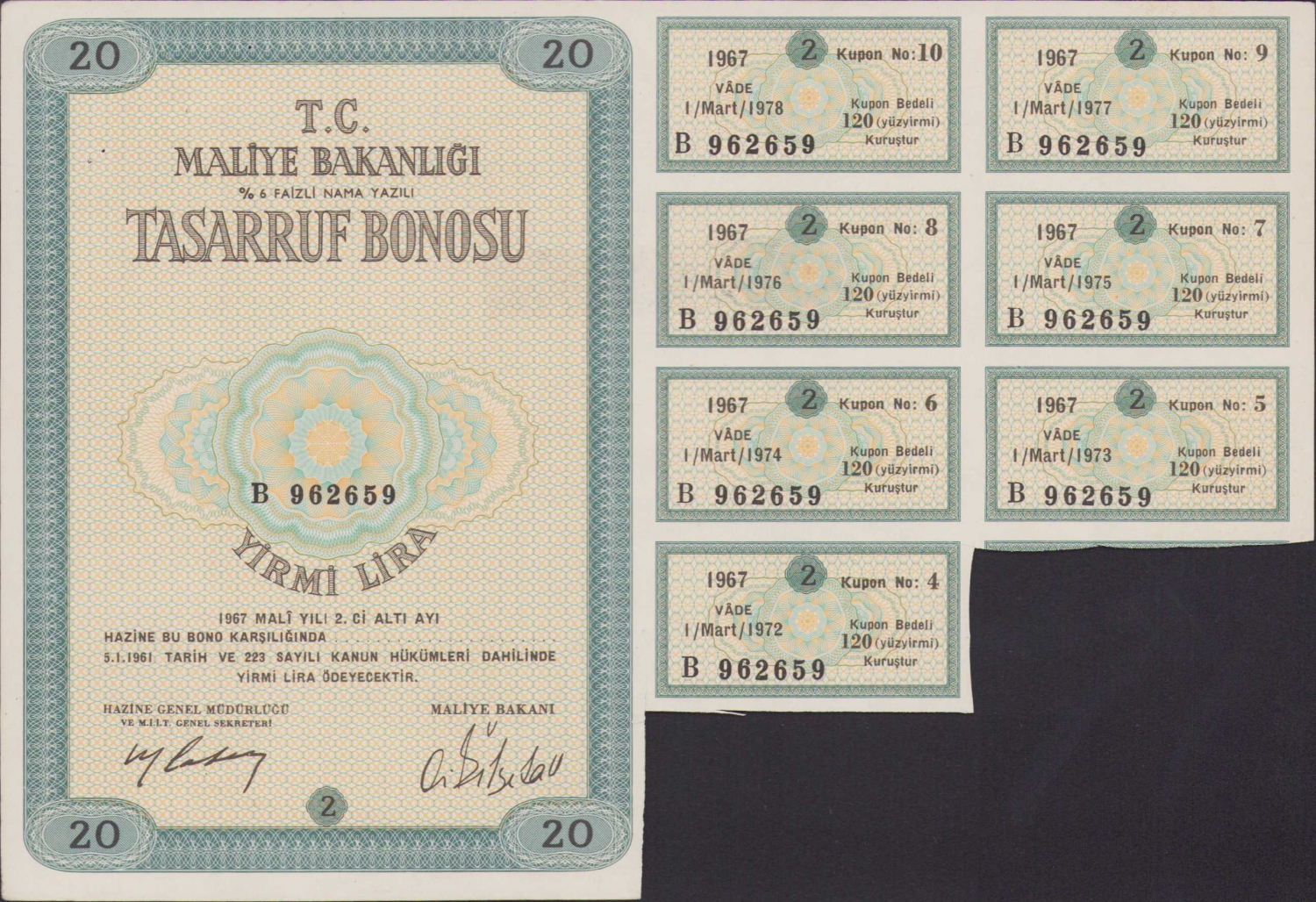 TC. Maliye Bakanlığı Tasarruf Bonosu, 1962-1967 tarihleri arasında 7 adet, 10-20-50 Liralık, 22x15cm