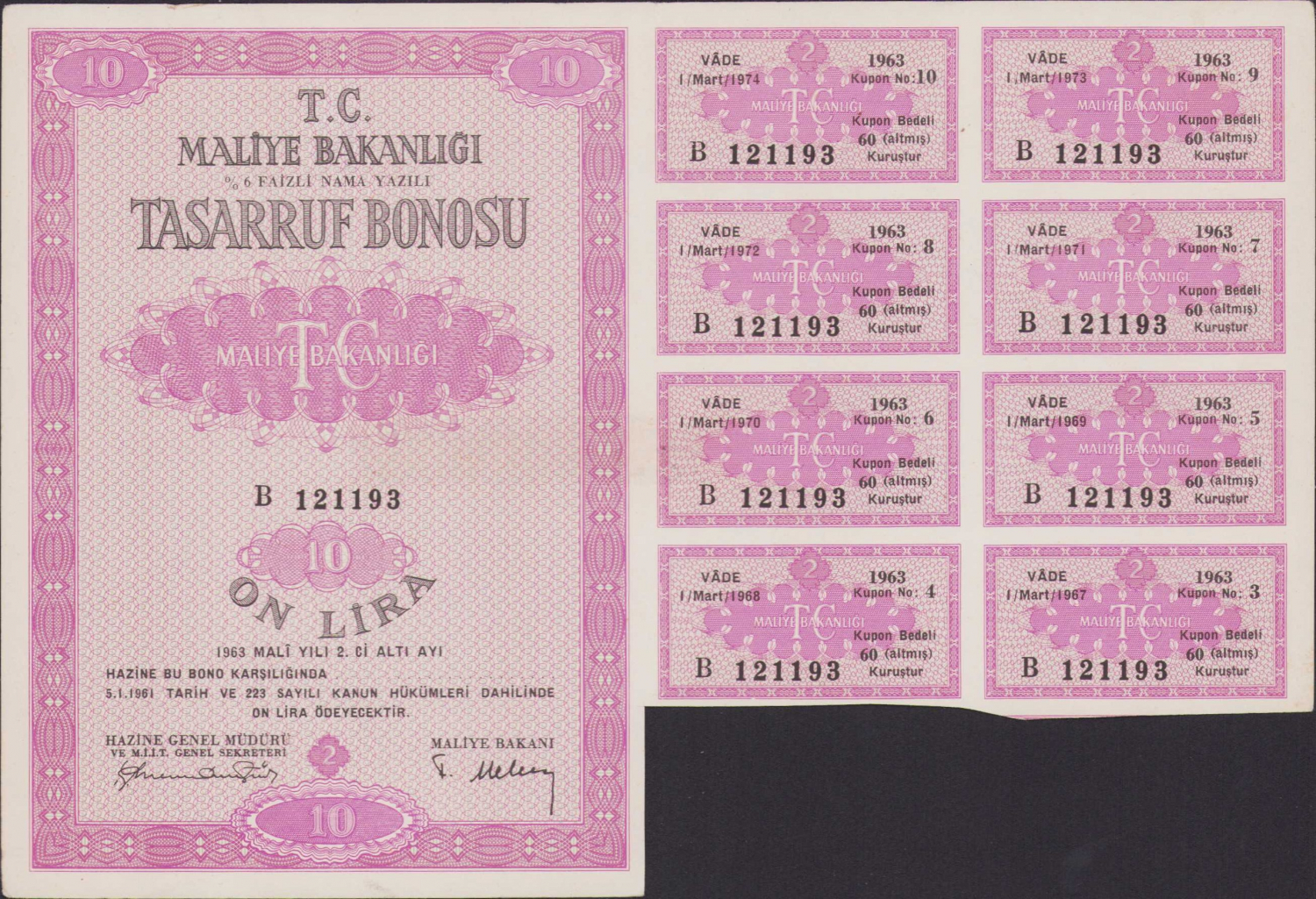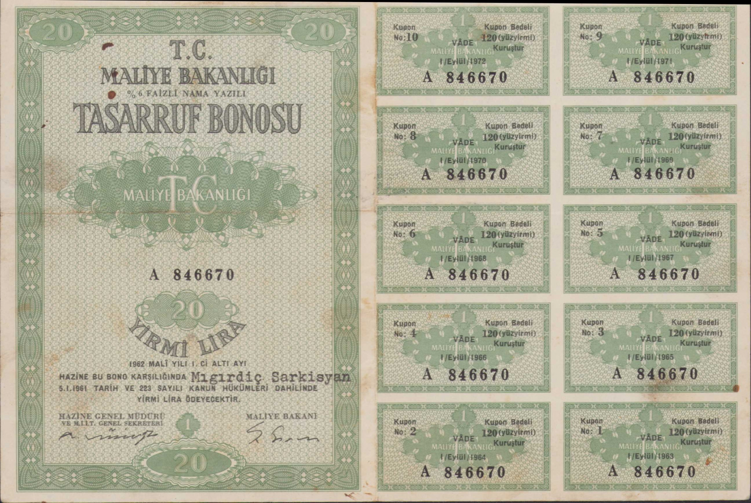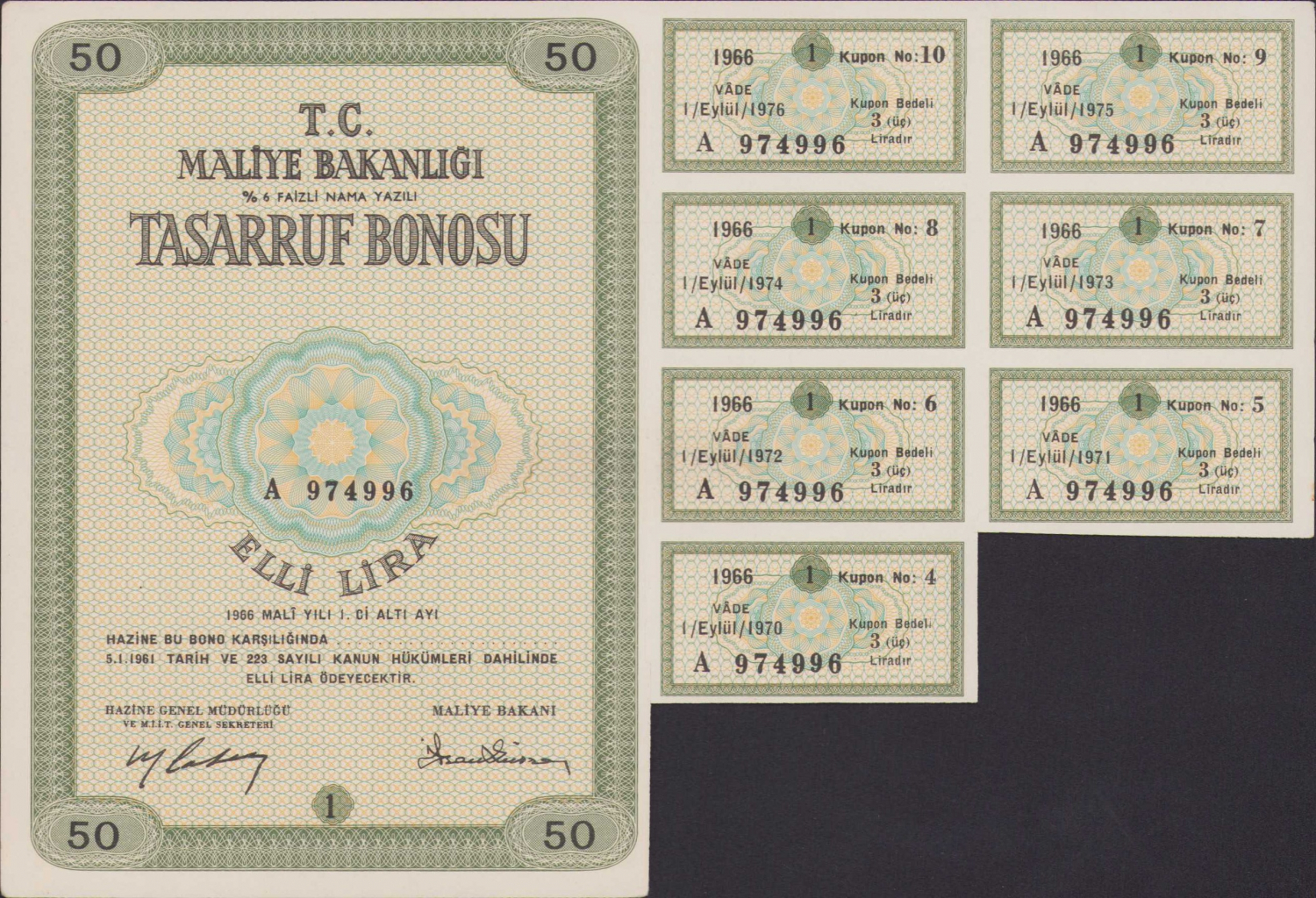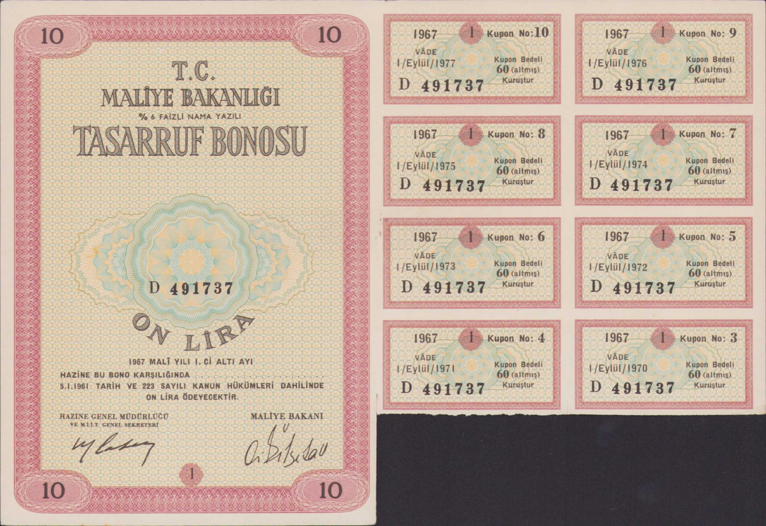 TC. Maliye Bakanlığı Tasarruf Bonosu, 1962-1967 tarihleri arasında 7 adet, 10-20-50 Liralık, 22x15cm