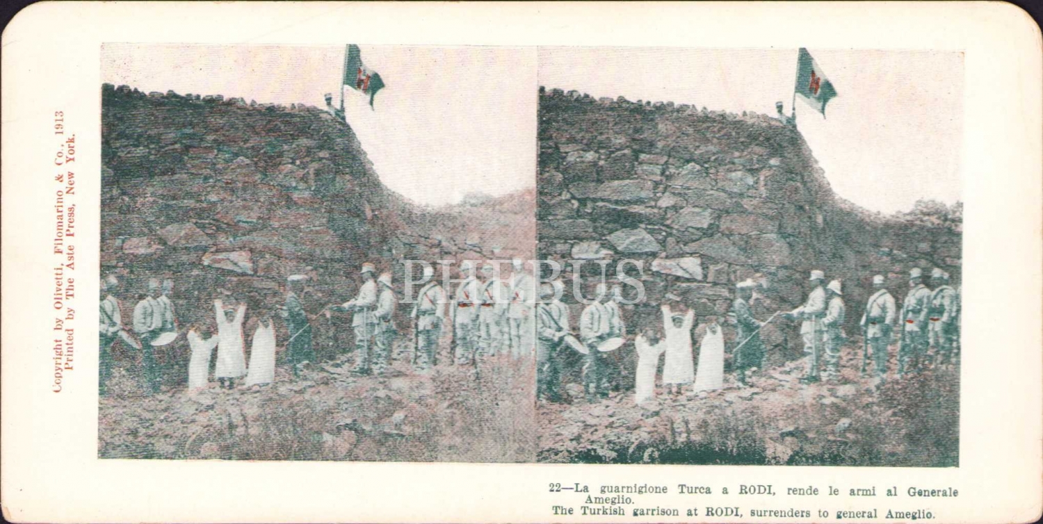 Stereoview kartpostal, 1911 Türk - İtalyan savaşı, Rodos'taki Türk garnizonu silah verirken, New York baskı 1913, 16x8 cm