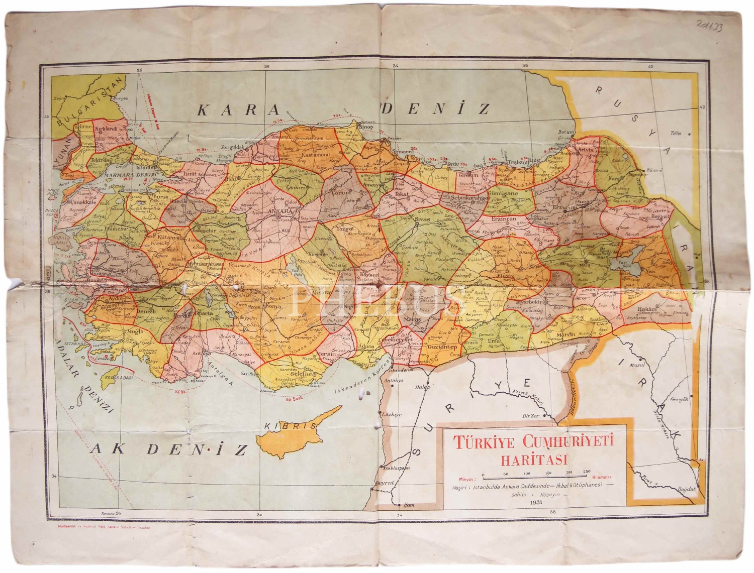 1931 İkbal Kütüphanesi baskısı Türkiye Cumhuriyeti Haritası, haliyle, 47x62 cm