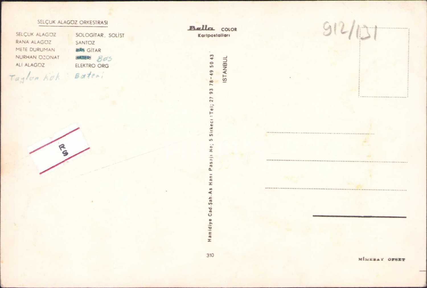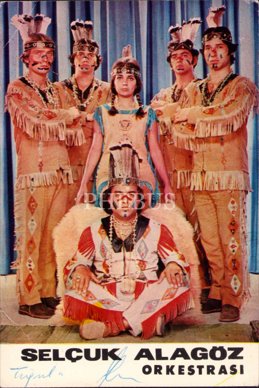 Selçuk Alagöz Orkestrası kartpostal, bateri Tuğrul Kök imzalı, 10x15 cm