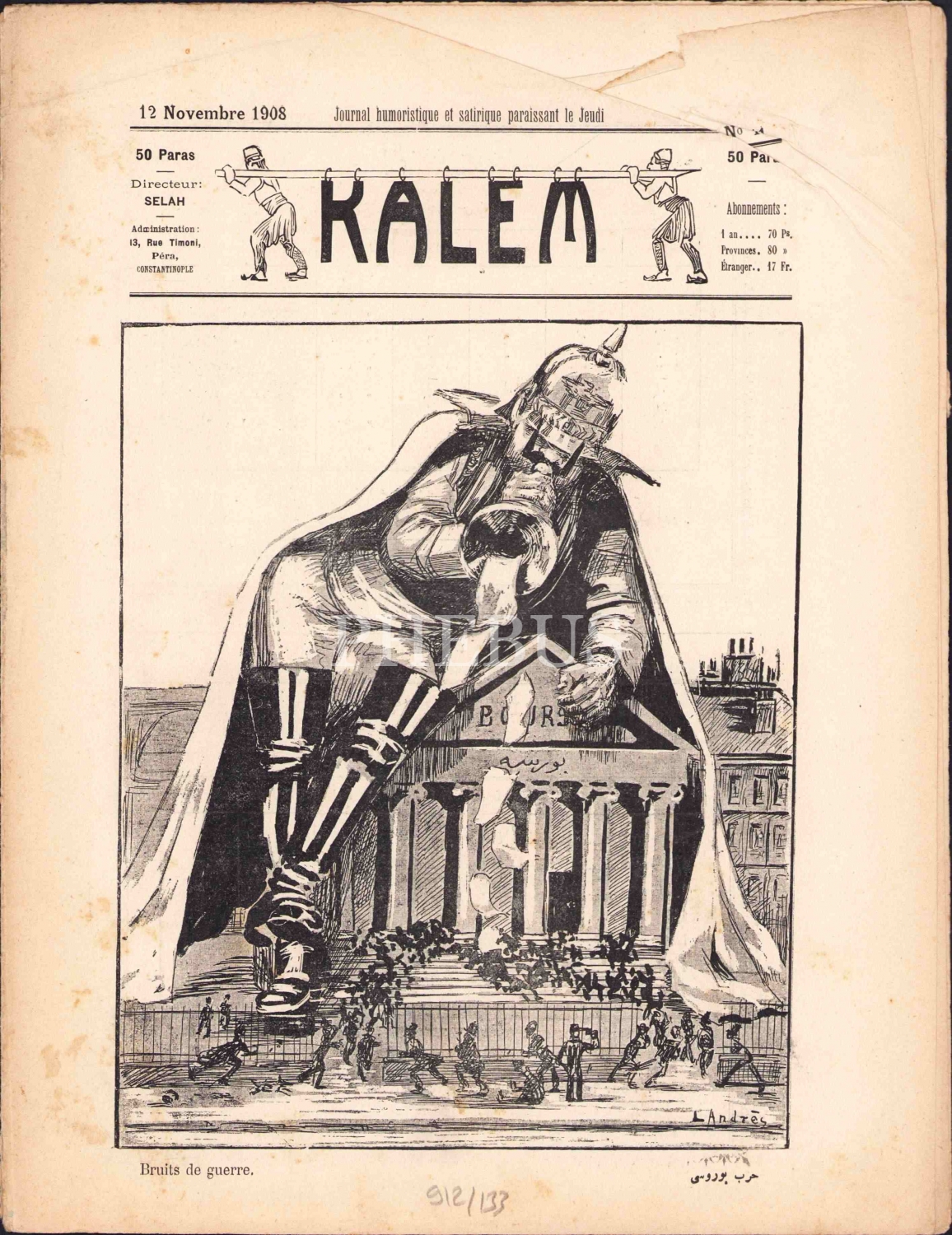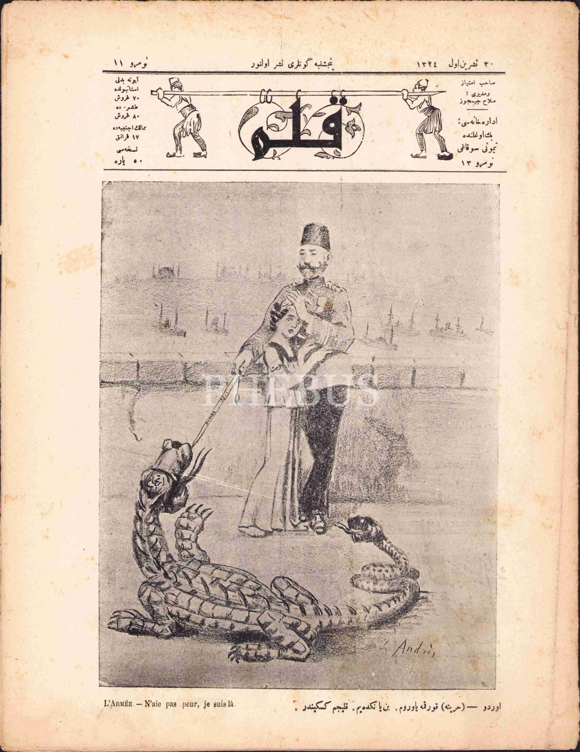 Osmanlıca - Fransızca, Kalem mizah mecmuası, kapak Andrea çizim, 12 Kasım 1908, 14 sayfa, 21x27 cm