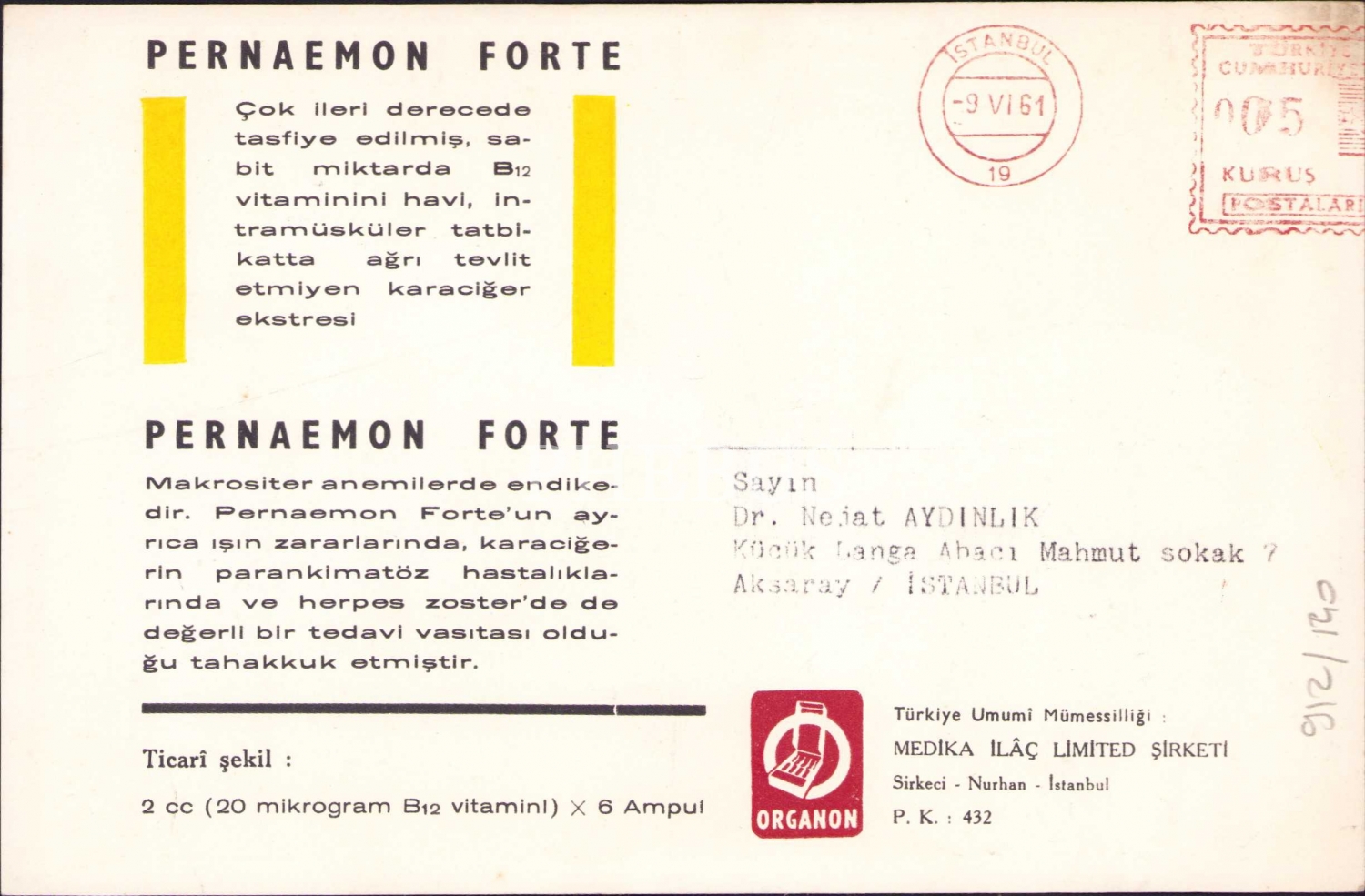 Pernaemon Forte el ilanı Nejat Aydınlık'a gönderilmiş, postadan geçmiş, , 13x21 cm
