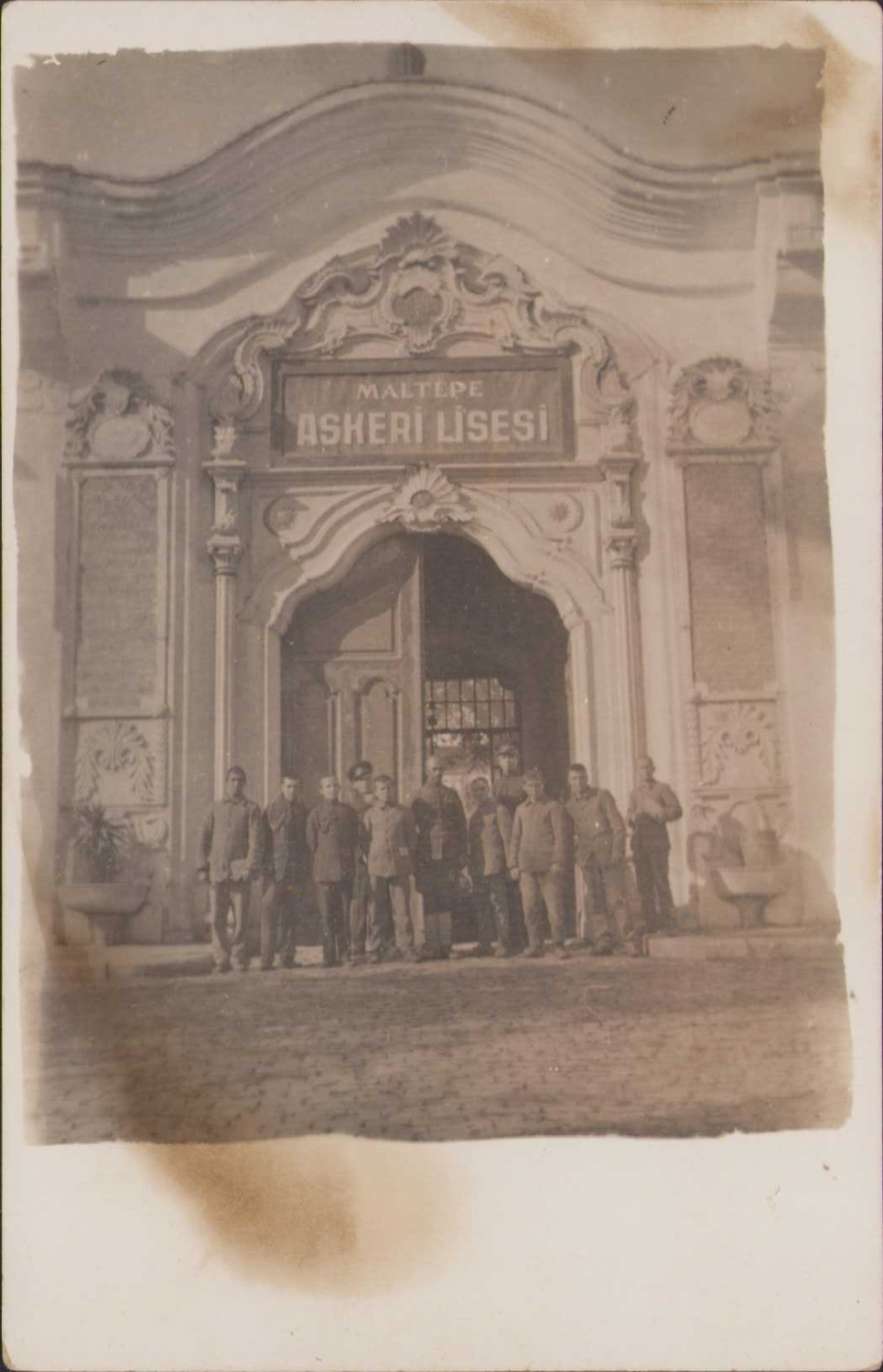 Maltepe Askeri Lisesi önünde talebeler, 1930 tarihli, arkası Osmanlıca yazılı