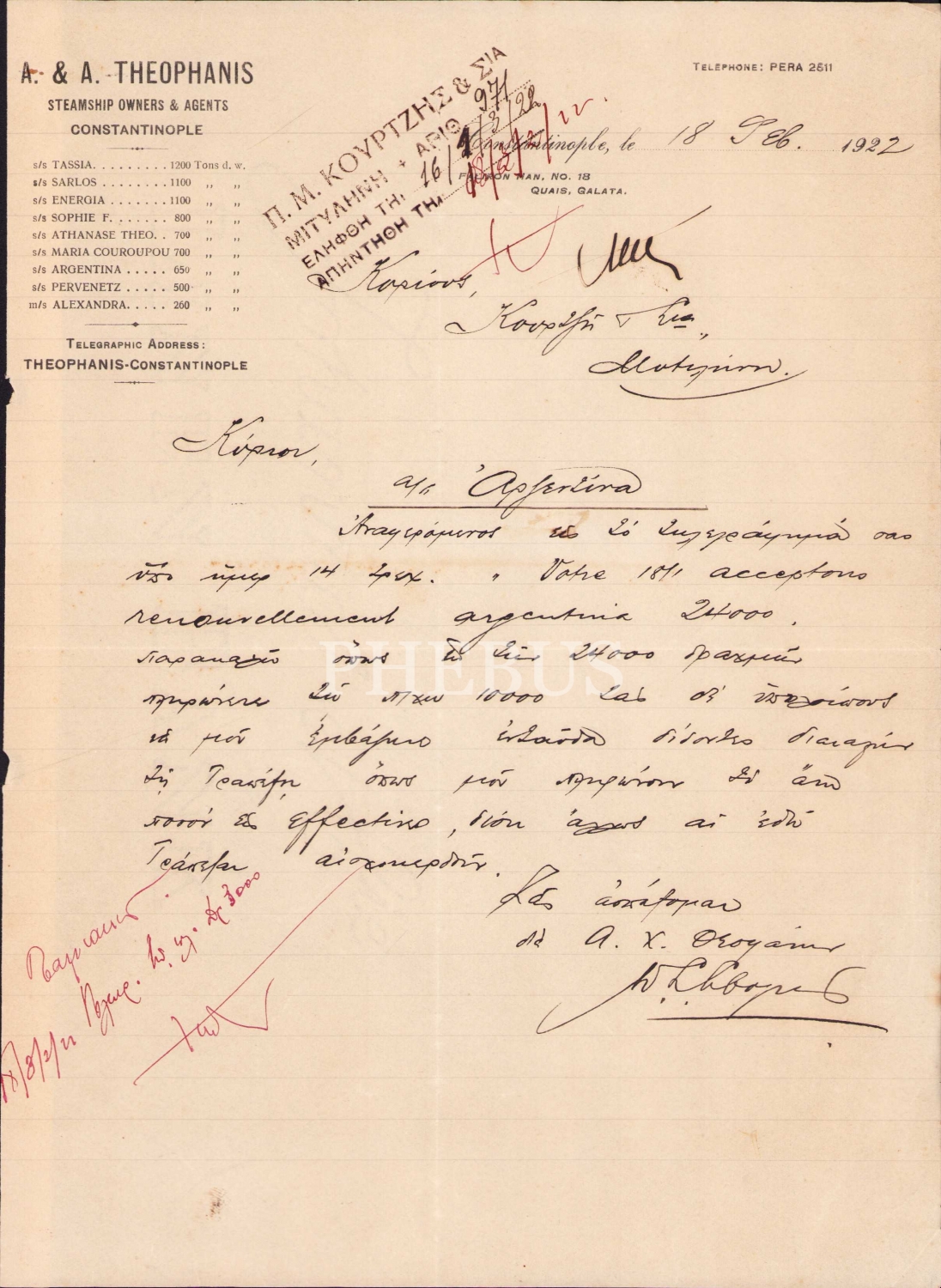 A. & A. Theophanis Constantinople antetli Rumca damgalı, 1922 tarihli doküman, 20x27 cm