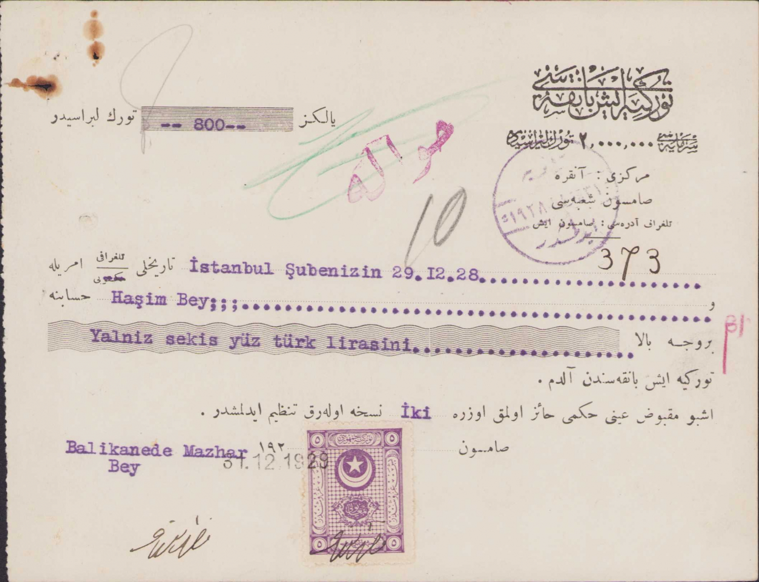 Osmanlı Türkiye İş Bankası Samsun Şubesi'ne ait makbuz, 1929 tarihli, pullu damgalı, 18x14cm