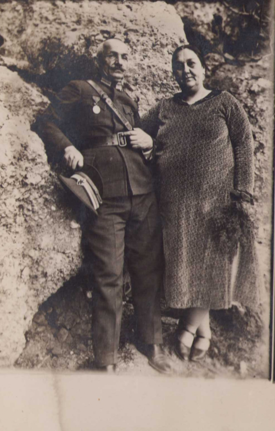 Madalyalı Türk subayı 1930'larda Muğla'da açık alanda eşiyle birlikte hatıra fotoğrafı, 9x14cm