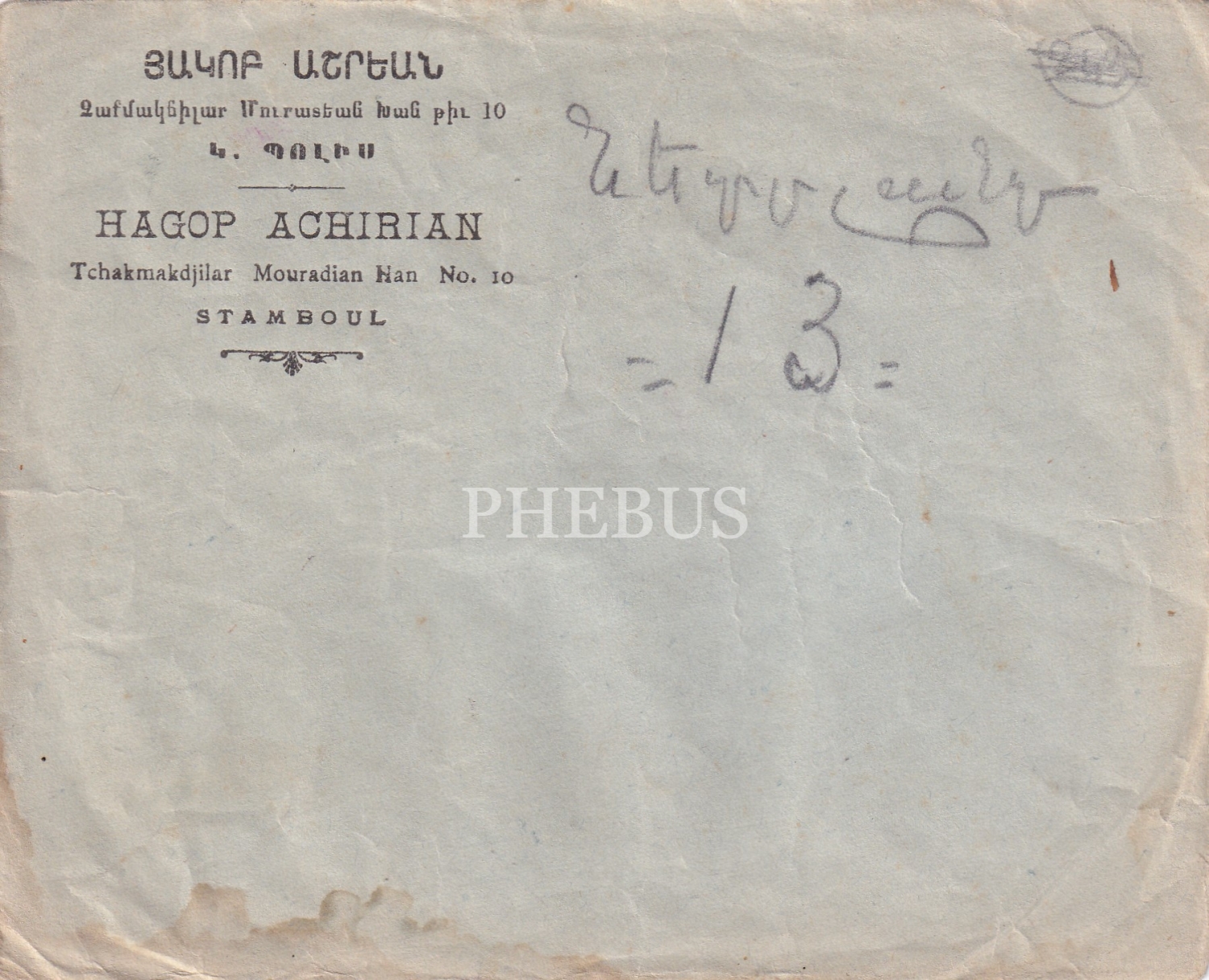 Ermenice - Fransızca İstanbul'da Hagop Achirian Ticarethanesi Antetli Zarf