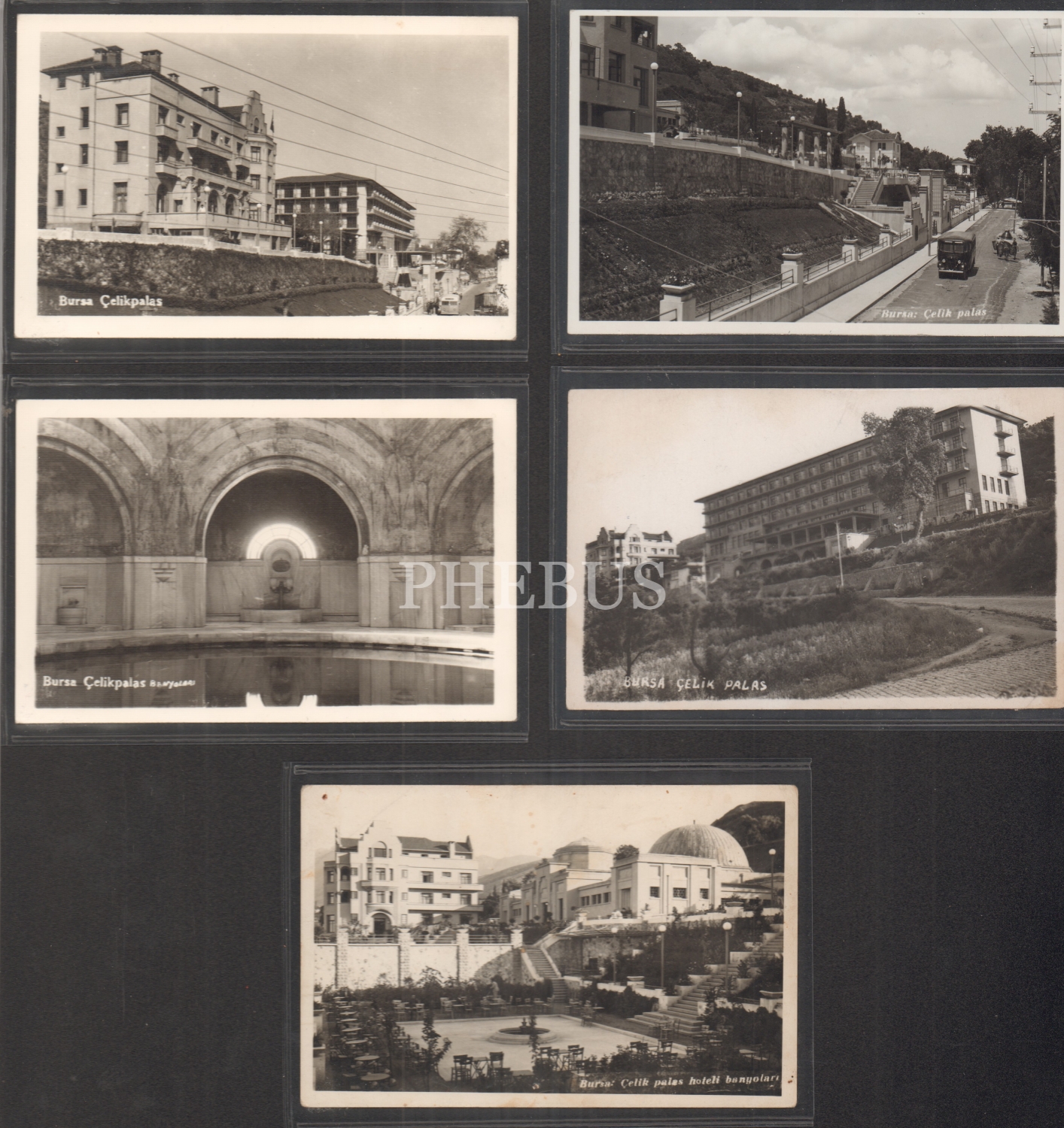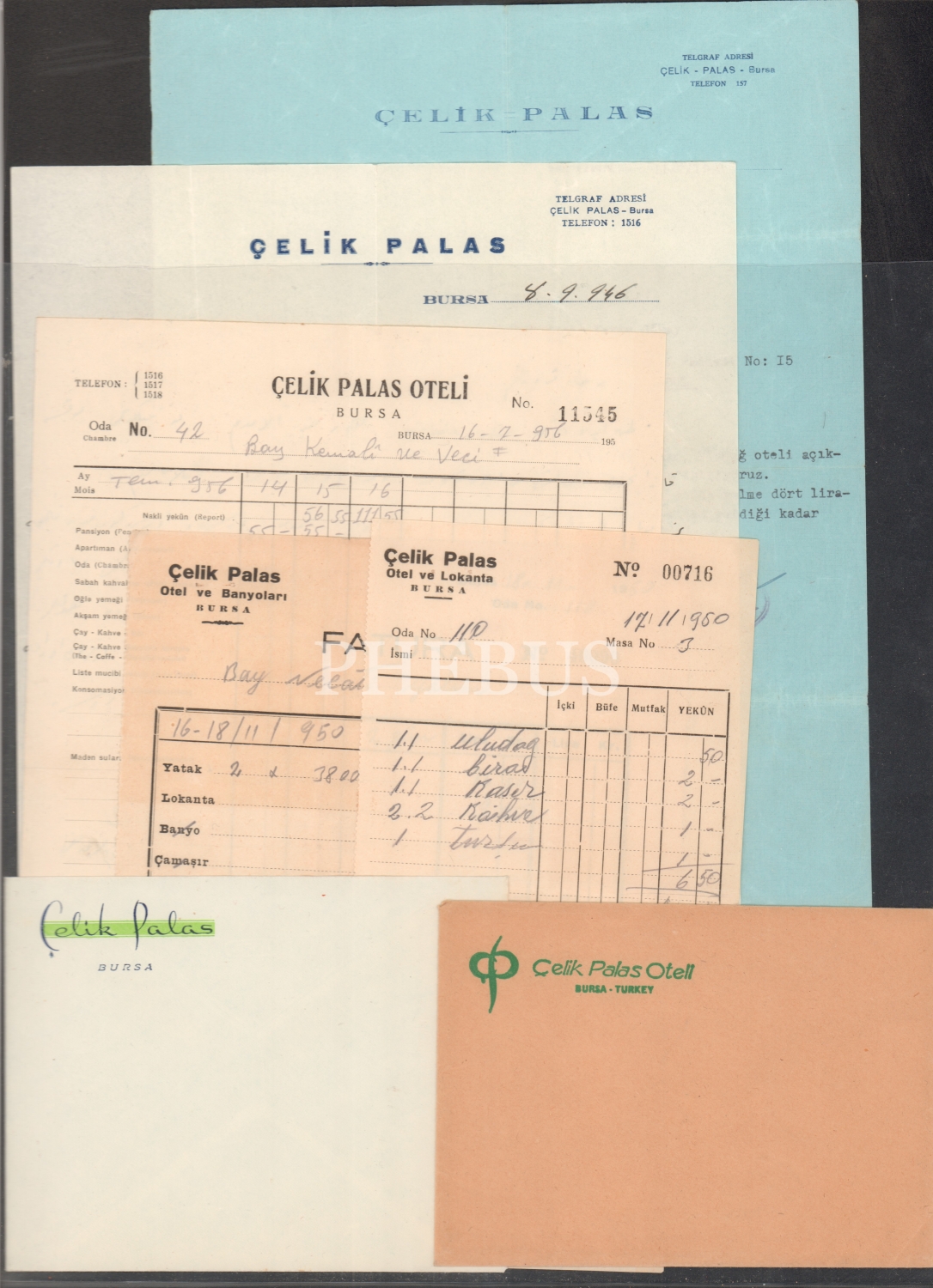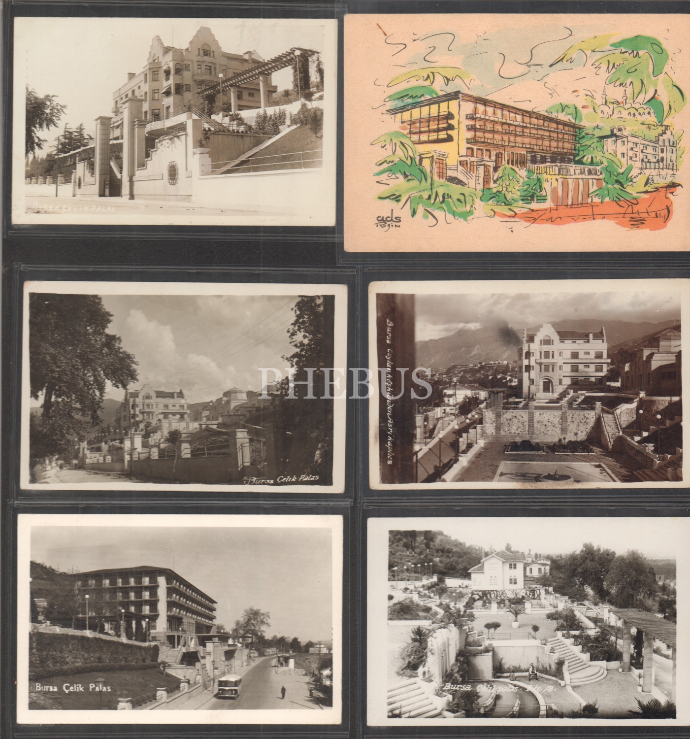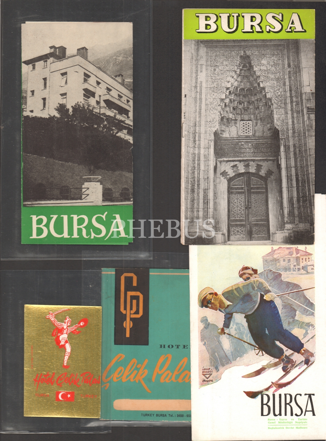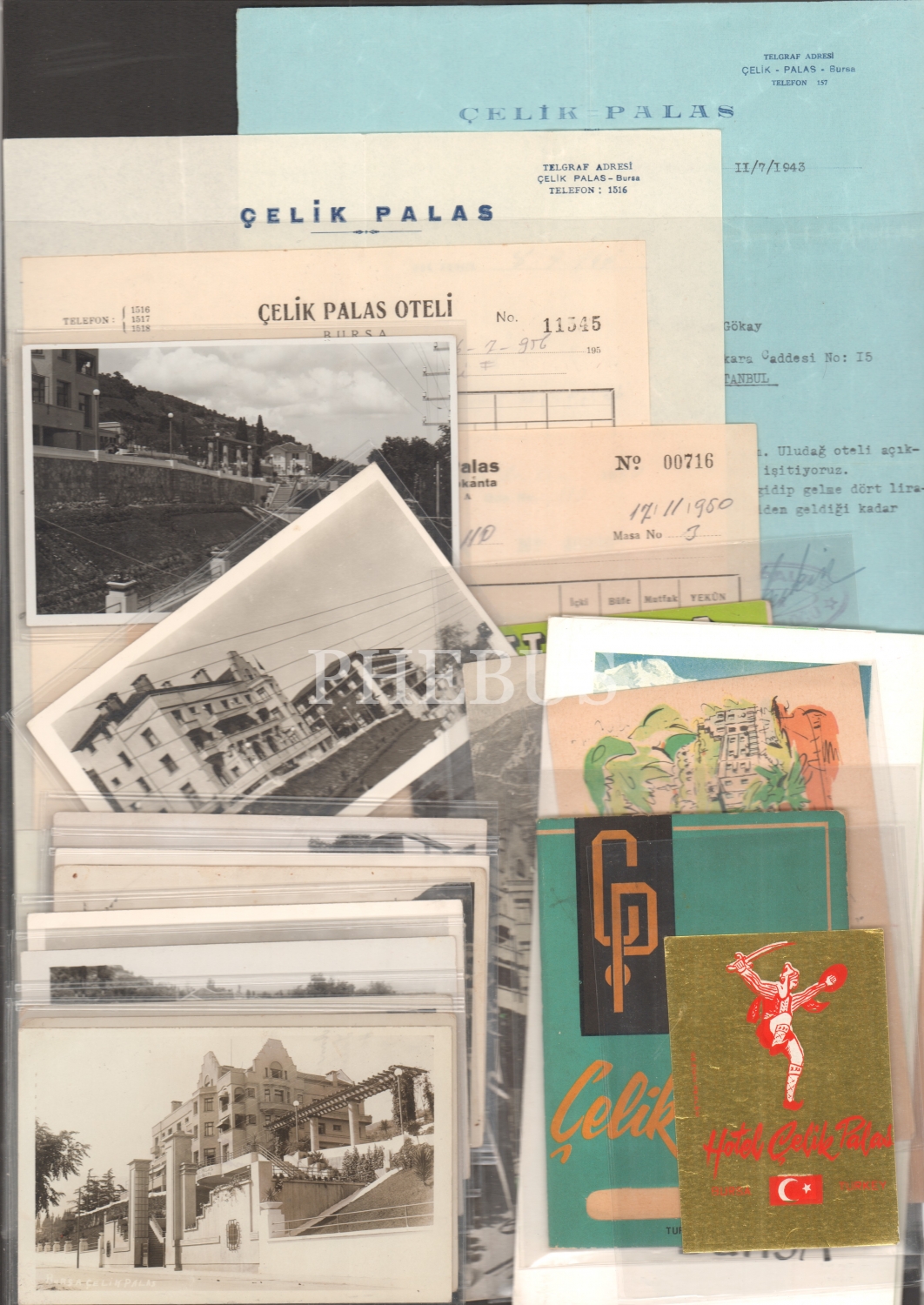 Bursa Çelikpalas Oteline Ait 10 Adet Fotokart, 1 Kartpostal, 1'i İhap Hulusi Çizimi Olan 4 Adet Broşür, 1 Adet Bavul Etiketi, 2 Adet Antetli Zarf, 5 Adet Antetli Evrak Lotu