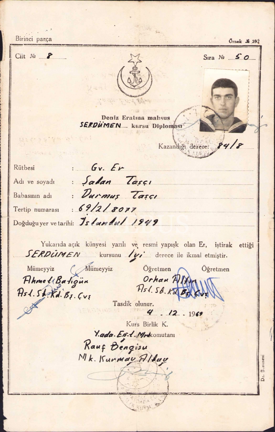 Deniz Eratına mahsus Serdümen kursu diploması, 1969 tarihli, 17x28 cm