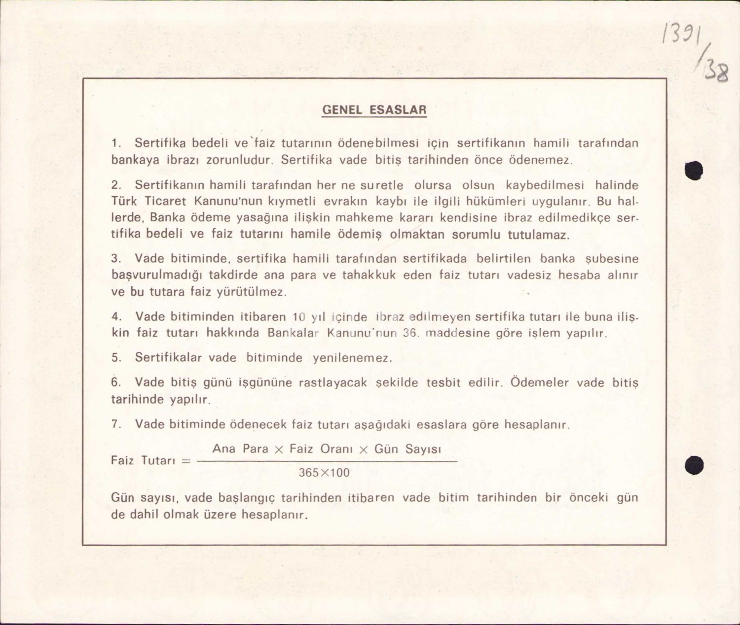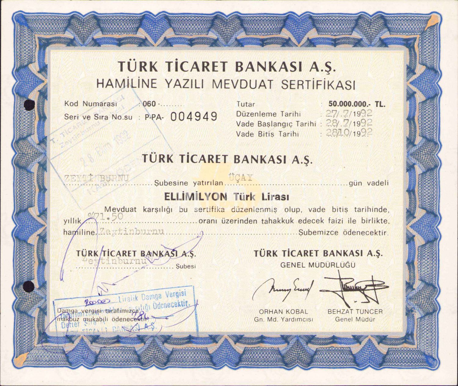 Türk Ticaret Bankası A.Ş. hamiline yazılı mevduat sertifikası, 19x16 cm