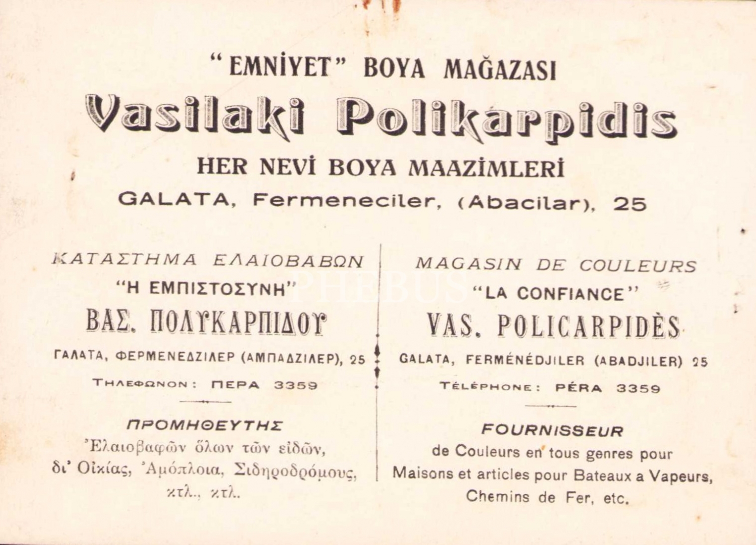 Türkçe, Fransızca, Rumca üç dilde iş yeri kartı, Emniyet Boya Mağazası Vesilaki Polikarpidis Her Nevi Boya Maazimleri Galata, postadan geçmiş, 11x9 cm