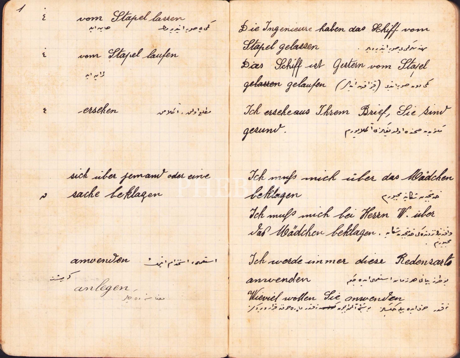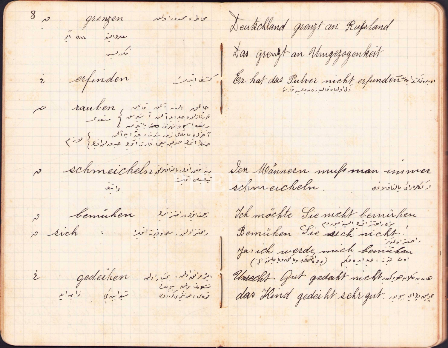Almanca muhtelif notların buşunduğu defter, sırt ve kapak haliyle, 11x20 cm