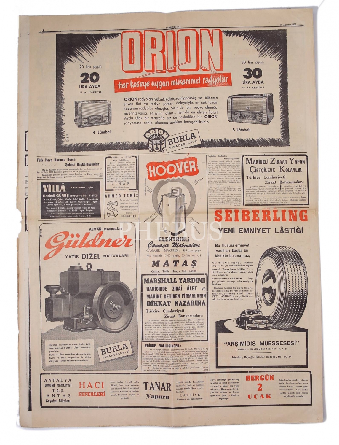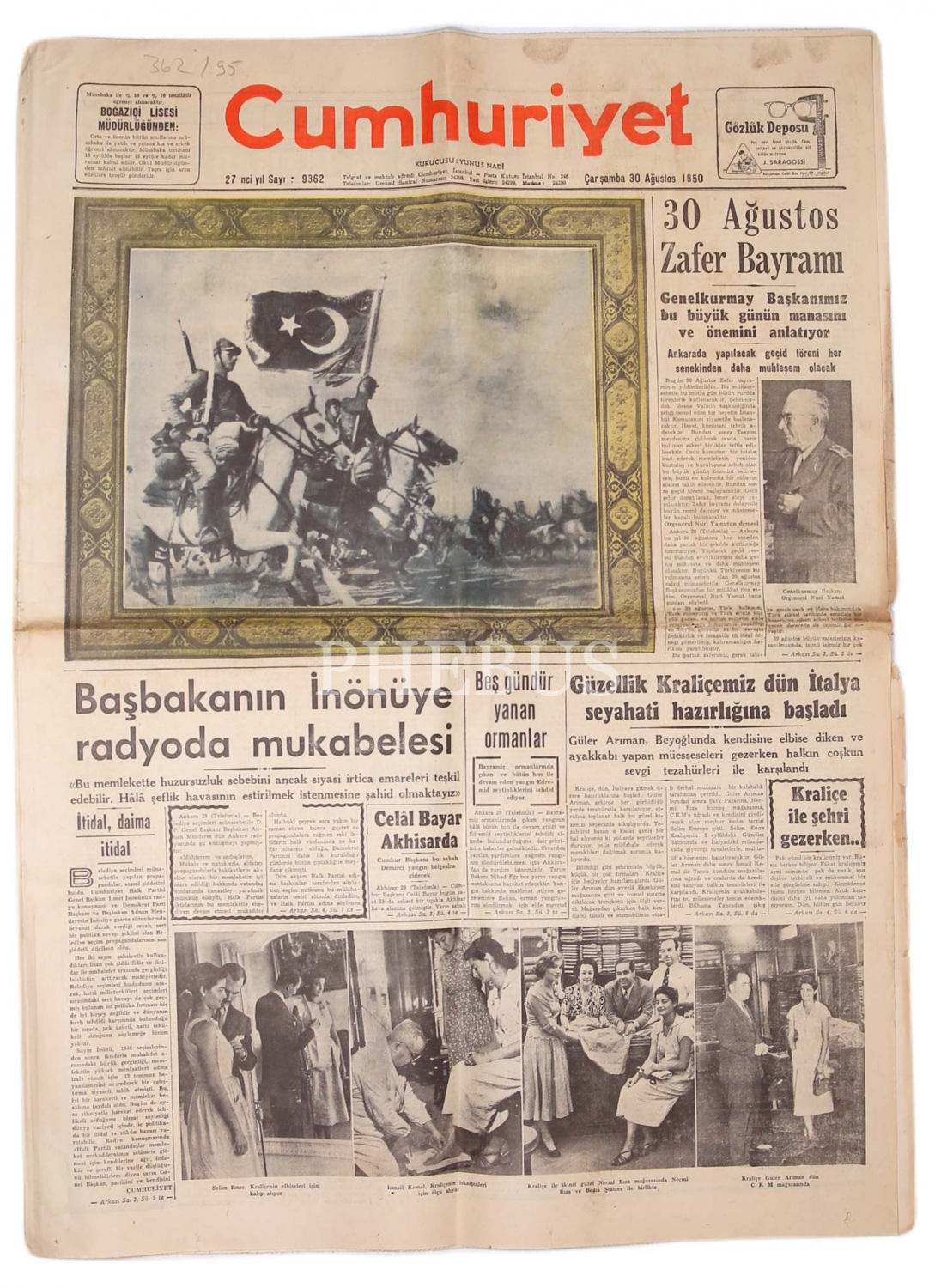 Cumhuriyet gazetesi, 30 Ağustos 1950, " 30 Ağustos Zafer Bayramı Genel Kurmay Başkanımız bu büyük günün manasını ve önemini anlatıyor", Türk bayrağı görselli