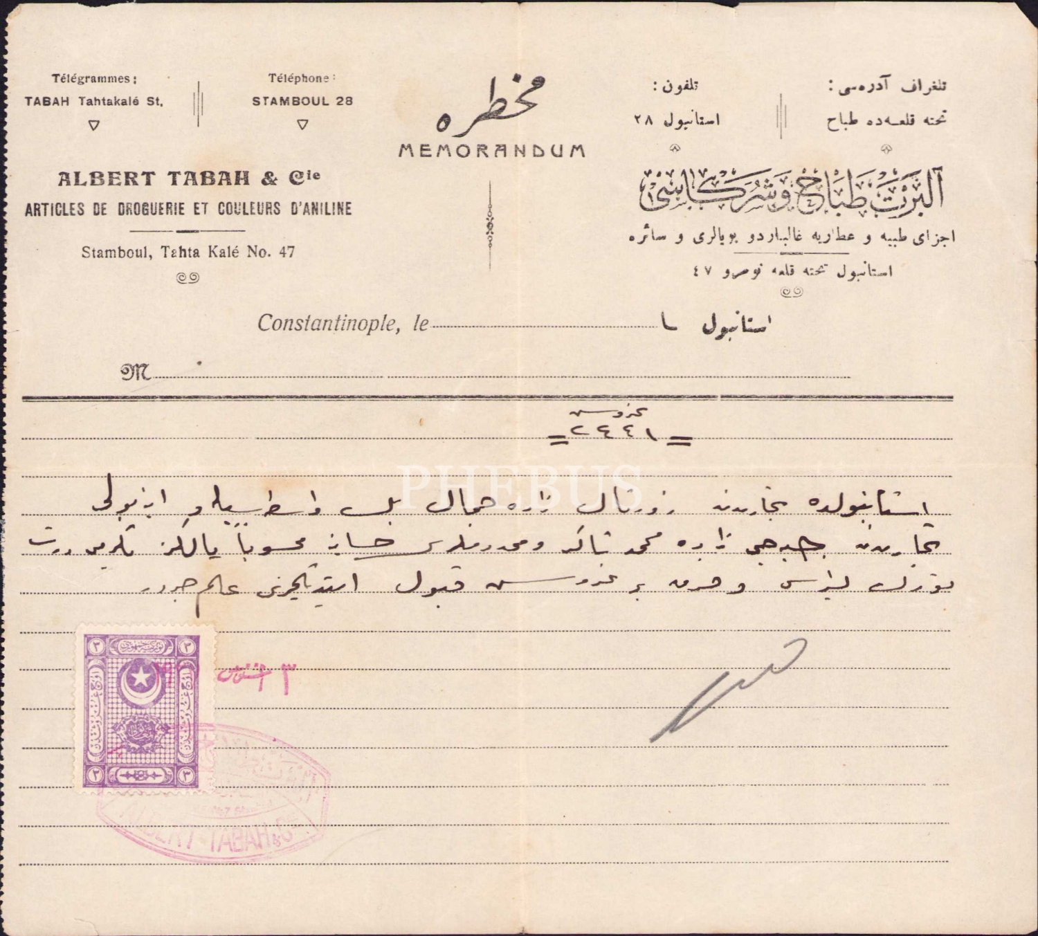 Osmanlıca - Fransızca Albert Tabah ve Şürekası antetli muhtıra, 1922 tarihli, postadan geçmiş, 19x17 cm