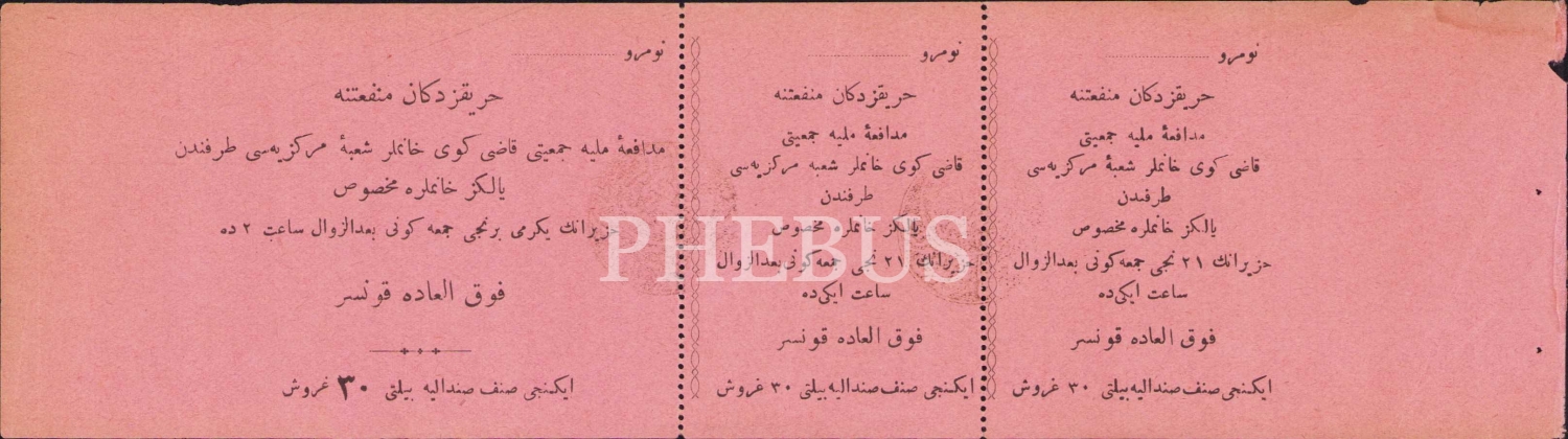 Osmanlıca Müdafai Milliye Cemiyeti Kadıköy Hanımlar Şubesi Merkezinde yangınzadelere yardım toplamak amacıyla yapılmış konsere ait bilet, 26x7 cm