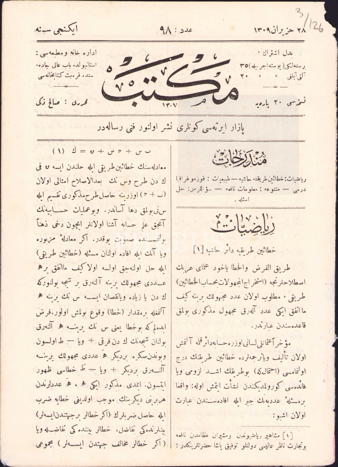 Osmanlıca Mektep risalesi, muharriri Salih Zeki, 28 Haziran 1309, 12 sayfa, 16x24 cm