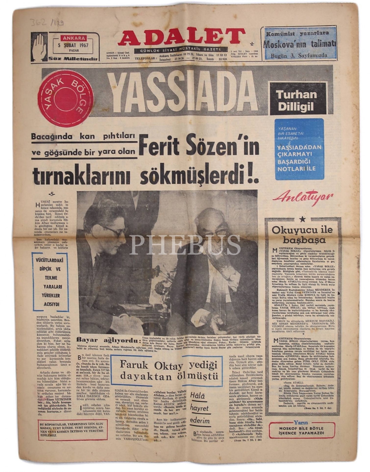 Adalet gazetesi, 5 Şubat 1967, "YASSIADA, Bacağında Kan Pıhtıları ve Göğsünde Bir Yara Olan Ferit Sözen'in Tırnaklarını Sökmüşlerdi!.", 8 sayfa, 43x60 cm