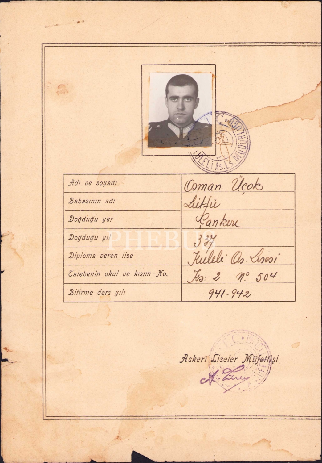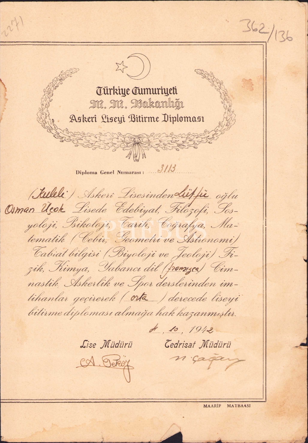 TC M. M. Bakanlığı Askeri Lise diploması, 1942, haliyle, 32x24 cm