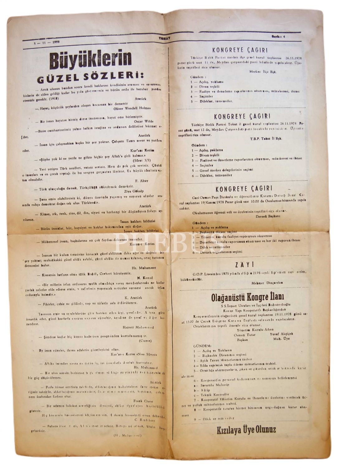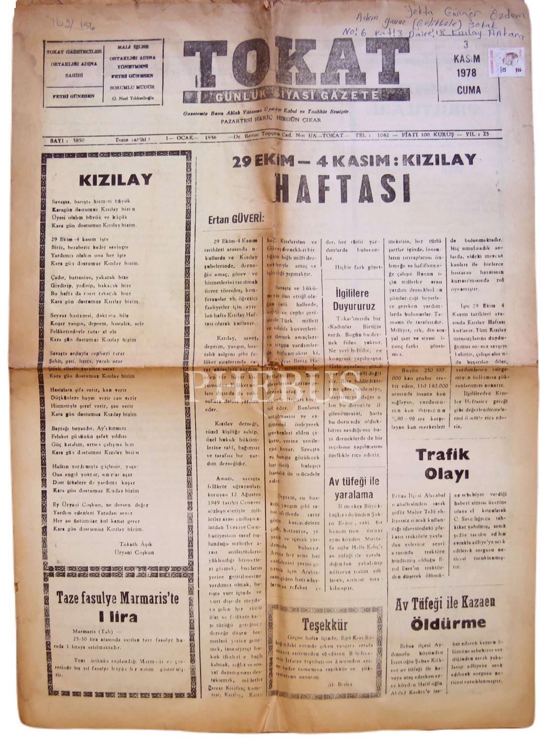 Tokat gazetesi, 3 Kasım 1978, "29 Ekim - 4 Kasım: Kızılay Haftası", postadan geçmiş, 4 sayfa, 40x60 cm