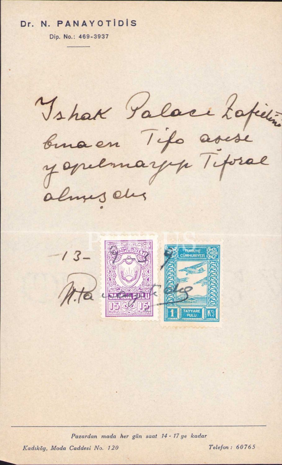 Dr. N. Panayotidis antetli 1939 tarihli reçete, 10x17 cm