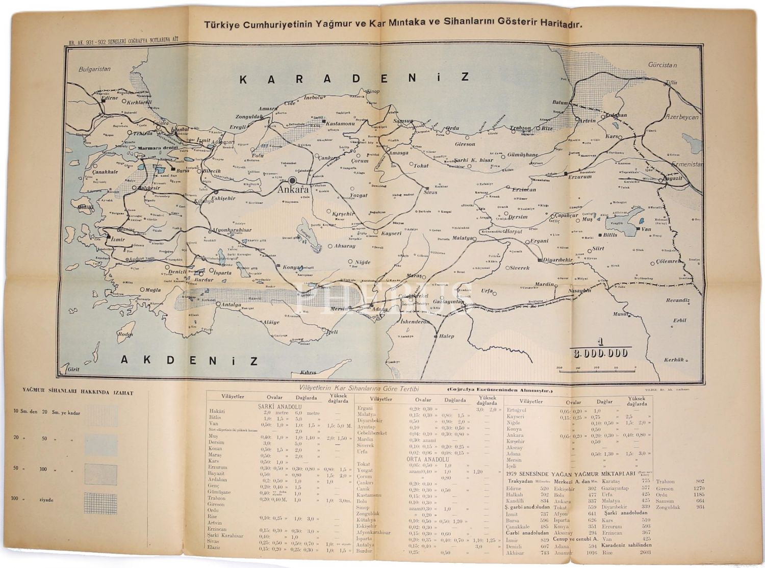 Türkiye Yağmur ve Kar Mıntıka ve Silahlarını Gösteren Harita, 1932 baskı, 64x47 cm
