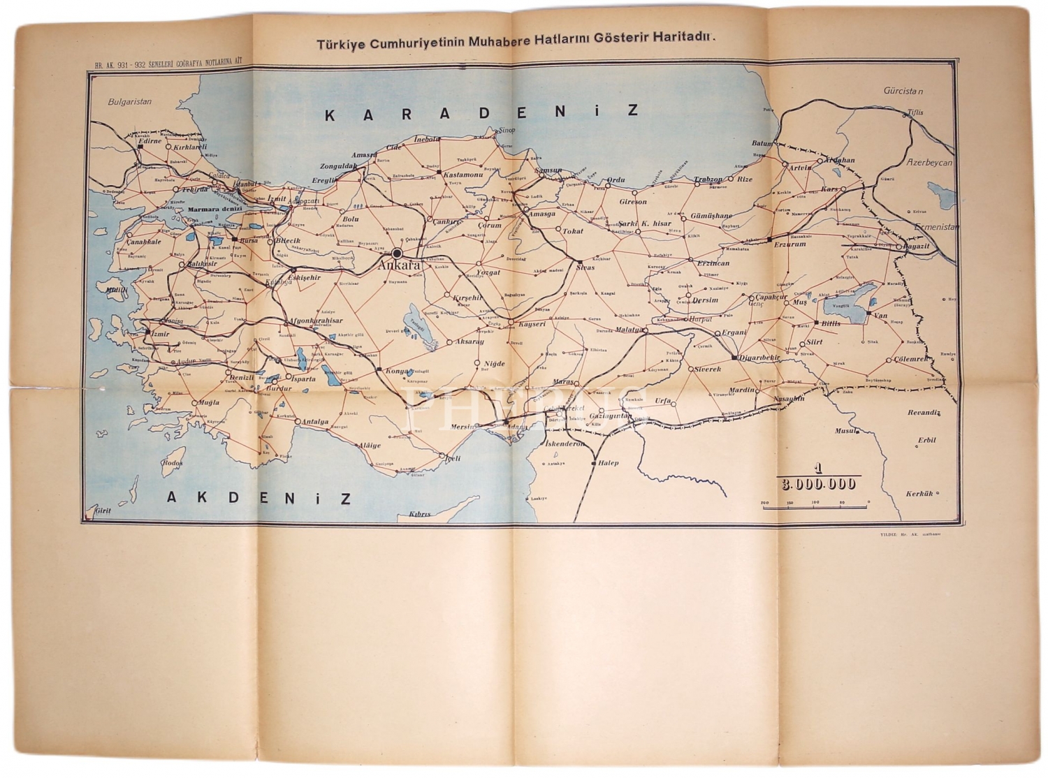 Türkiye Cumhuriyetinin Muhabere Hatlarını gösteren harita, kenarları yırtık, 64x46 cm
