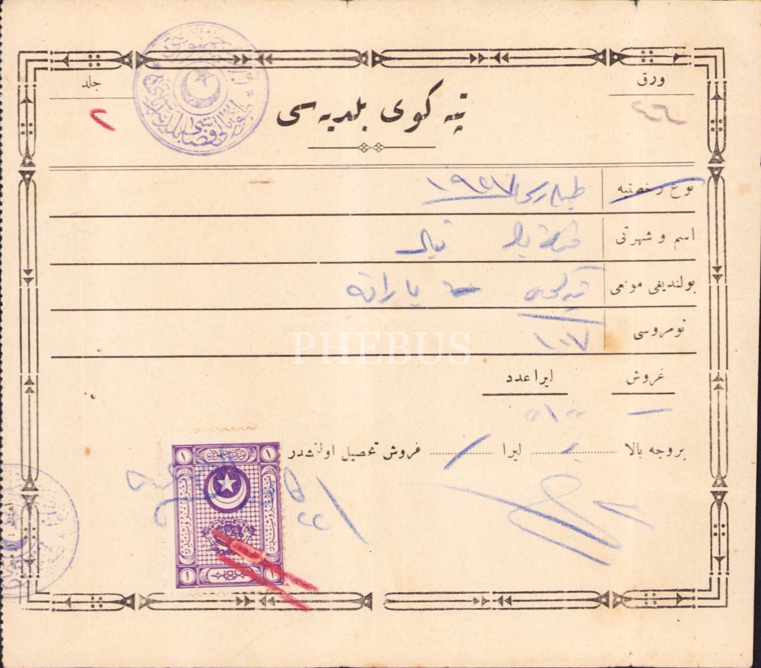 Osmanlıca Tepeköy Belediyesne ait Torbalı Kazası Belediye Riyaseti damgalı makbuz senedi, 13x15 cm