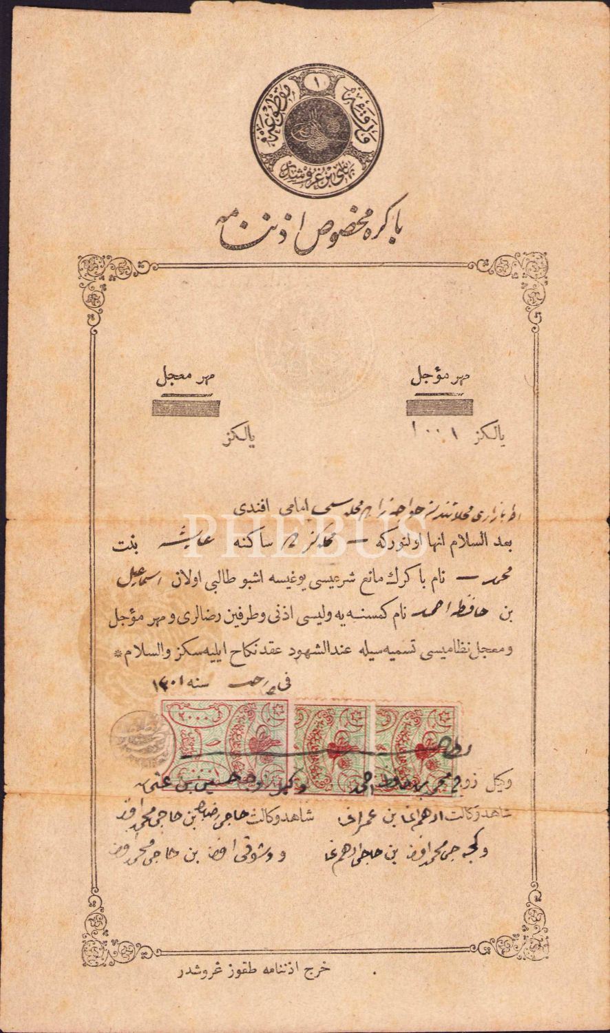 Hafız Ahmet'e ait Osmanlıca 1301 tarihli evlilik izinname belgesi, 14x22 cm
