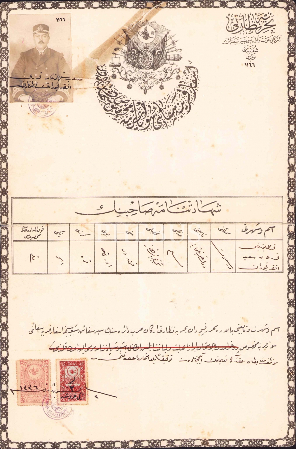 Osmanlıca Bahriye Nezareti antetli Uzak deniz süvarilerine mahsus şehadetname, 1336 tatihli, 24x36 cm
