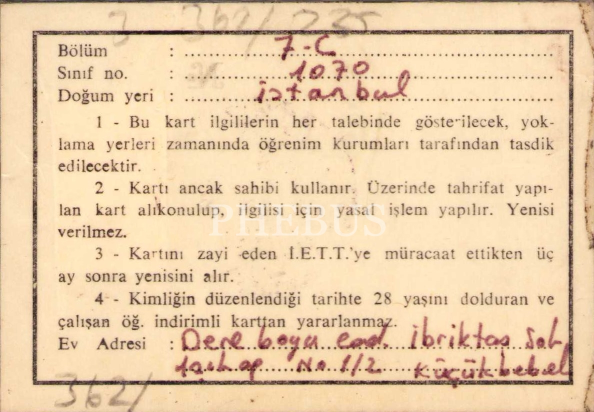 1982 - 1983 ders yılı Terakki Lisesi seyahat kartı, 10x6 cm