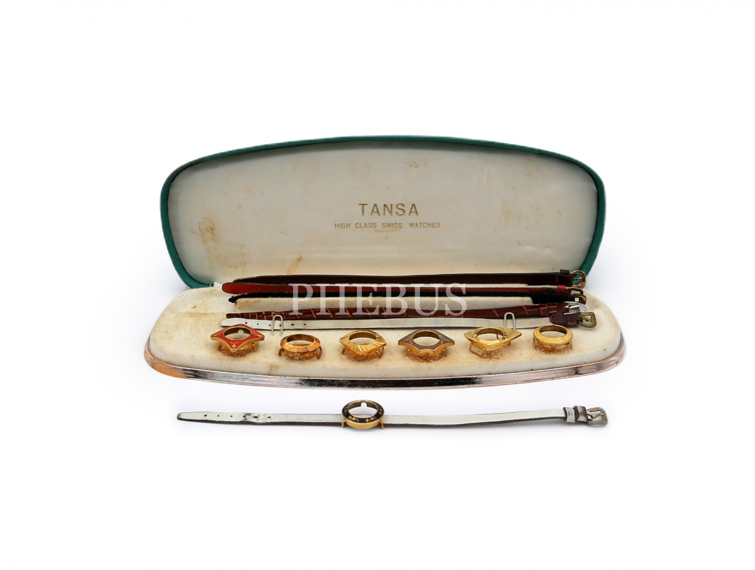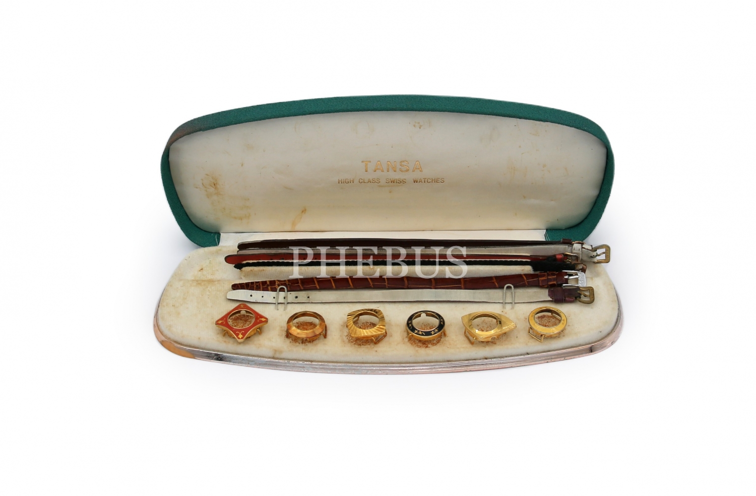 Tansa High Class Swiss Watches kutusunda 7 adet saat kordonu ve kopçası, kutunun ölçüsü 7x22x3 cm