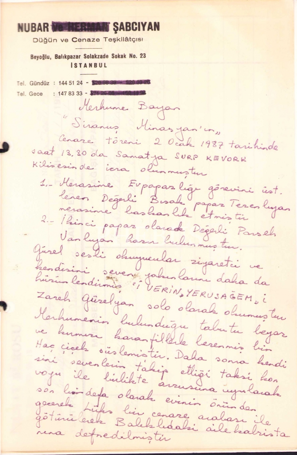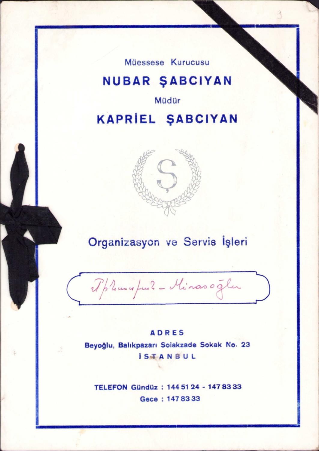 Nubar Şamcıyan - Kapriel Şabcıyan Organizasyon ve Servis İşleri doküman lotu, 15x21 cm