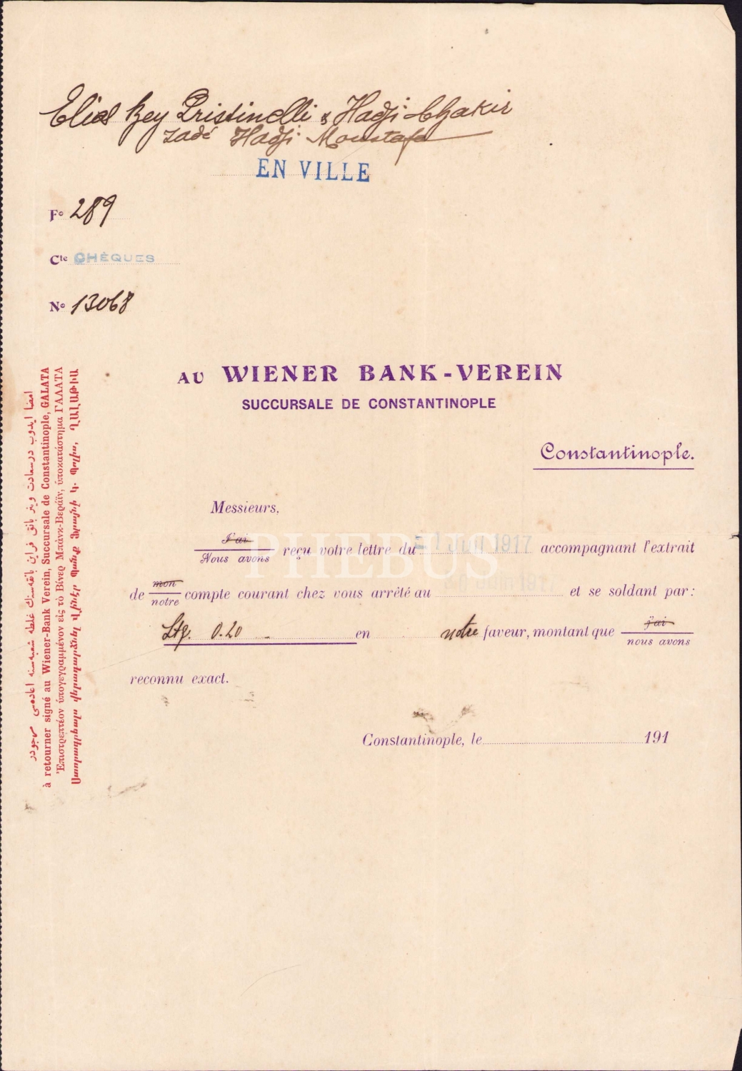Au Wiener Bank - Verein Constantinople antetli doküman, 20x30 cm