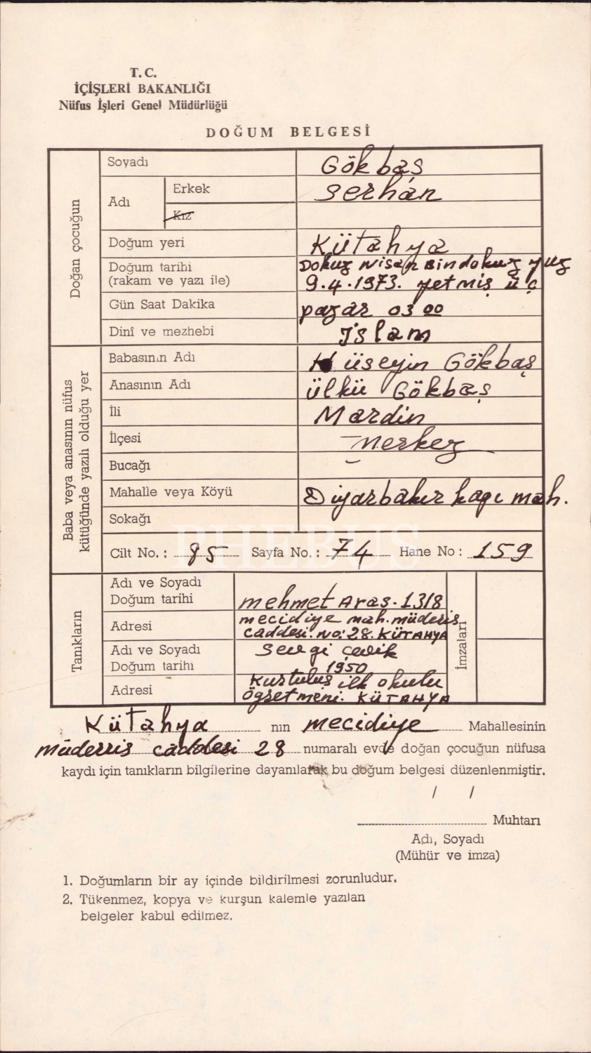 TC 1973 tarihli doğum belgesi, 15x29 cm