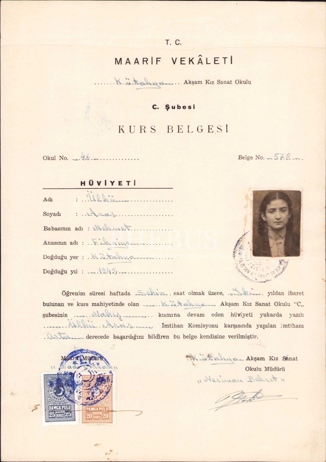 TC Maarif Vekaleti Kütahya Kız Sanat Okulu kurs belgesi, 20x28 cm