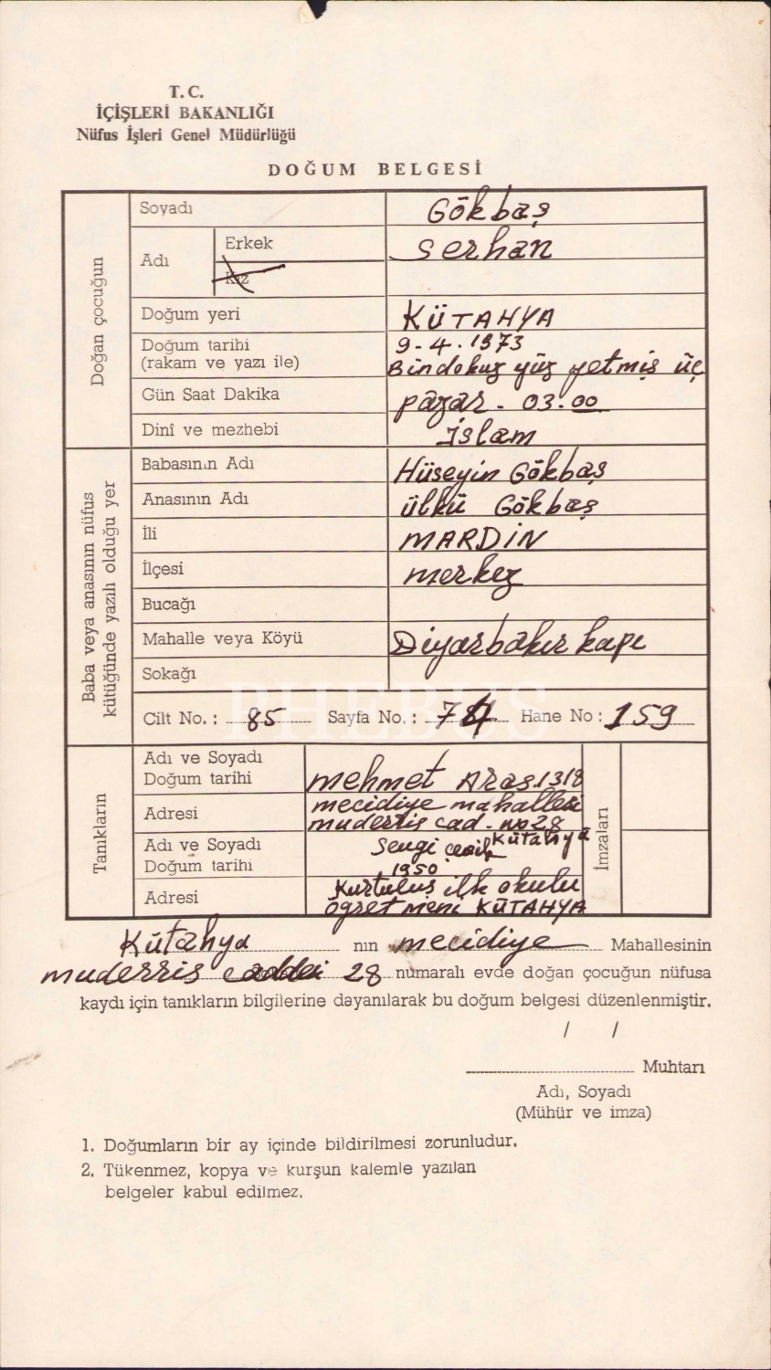 TC 1973 tarihli doğum belgesi, Kütahya, 16x27 cm