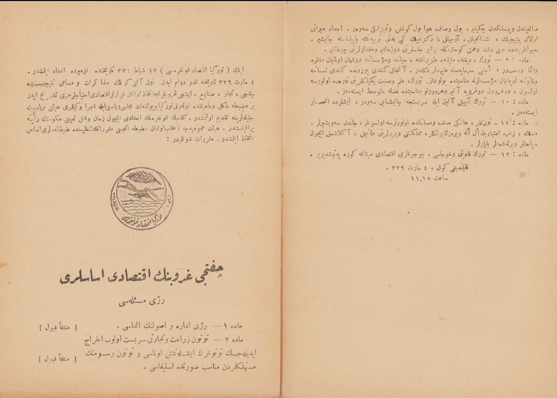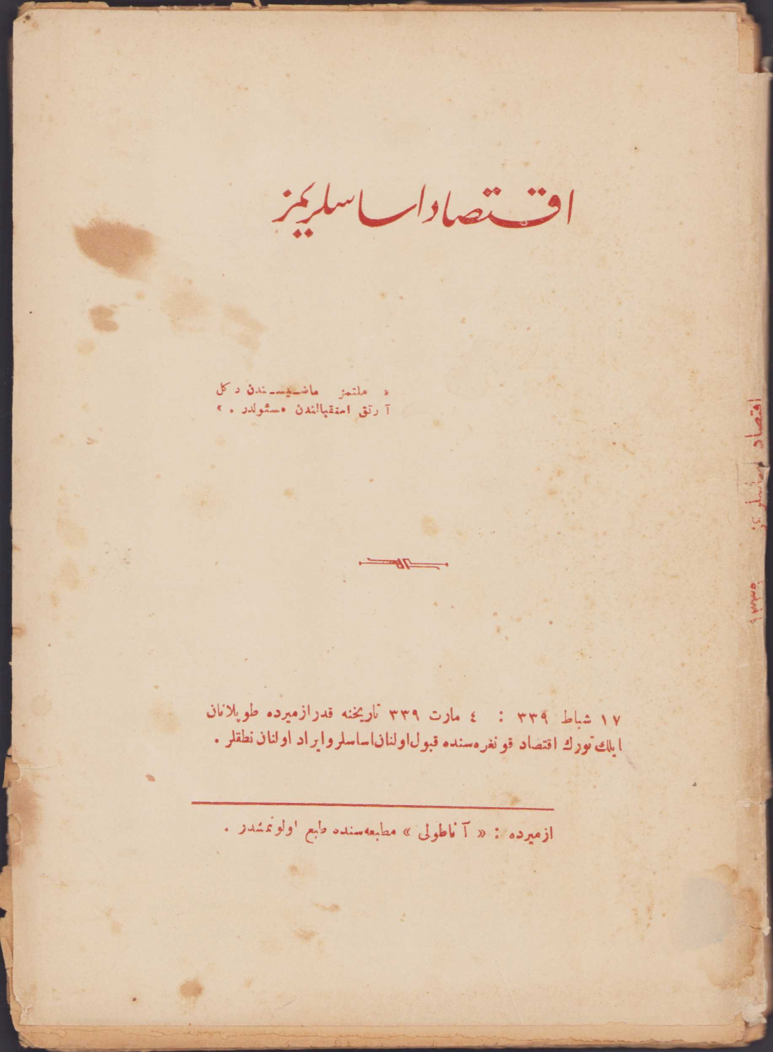 İktisat Esaslarımız, İlk Türk İktisat Kongresinde Kabul Olunan Esaslar ve İrad Olunan Nutuklar, Anadolu Matbaası, İzmir, Osmanlıca, 89 sayfa, 15x20cm