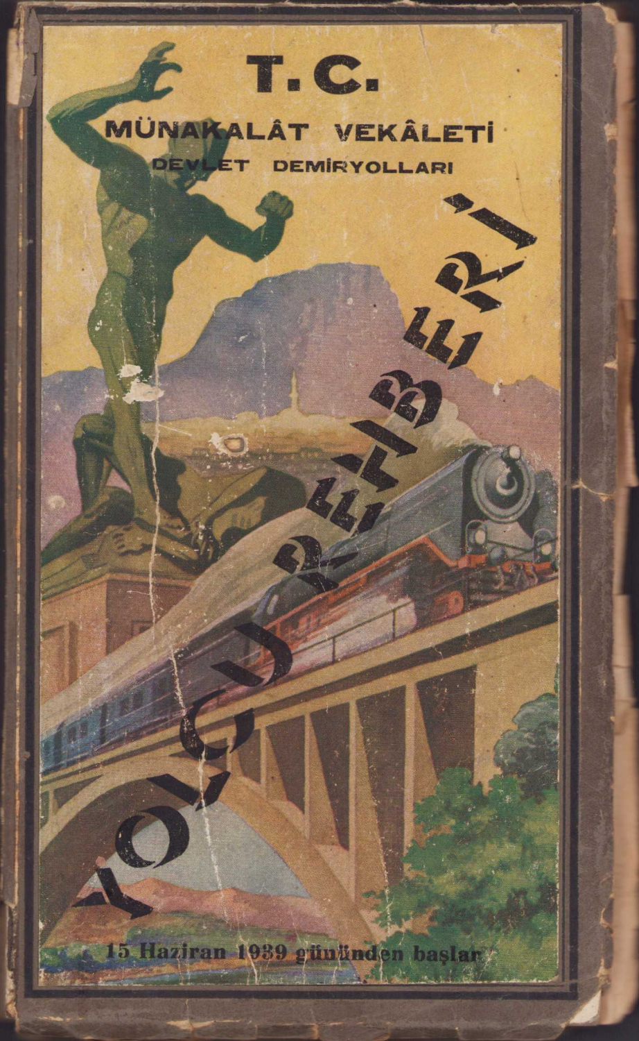 T. C. Münakalat Vekaleti Devlet Demiryolları Yolcu Rehberi - 15 Haziran 1939 gününden başlar, Demiryolları Matbaası, ek hat saatleri cetveli yer almakta, 220 sayfa, 11x19cm