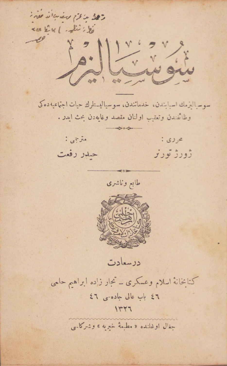 Haydar Rıfat'tan "muhterem Yusuf Beyefendiye" imzalı ithaflı Sosyalizm kitabı, J. Turner, Matbaa-i Hayriye ve Şirketi, 1326, Osmanlıca, 125 sayfa, 12x18cm