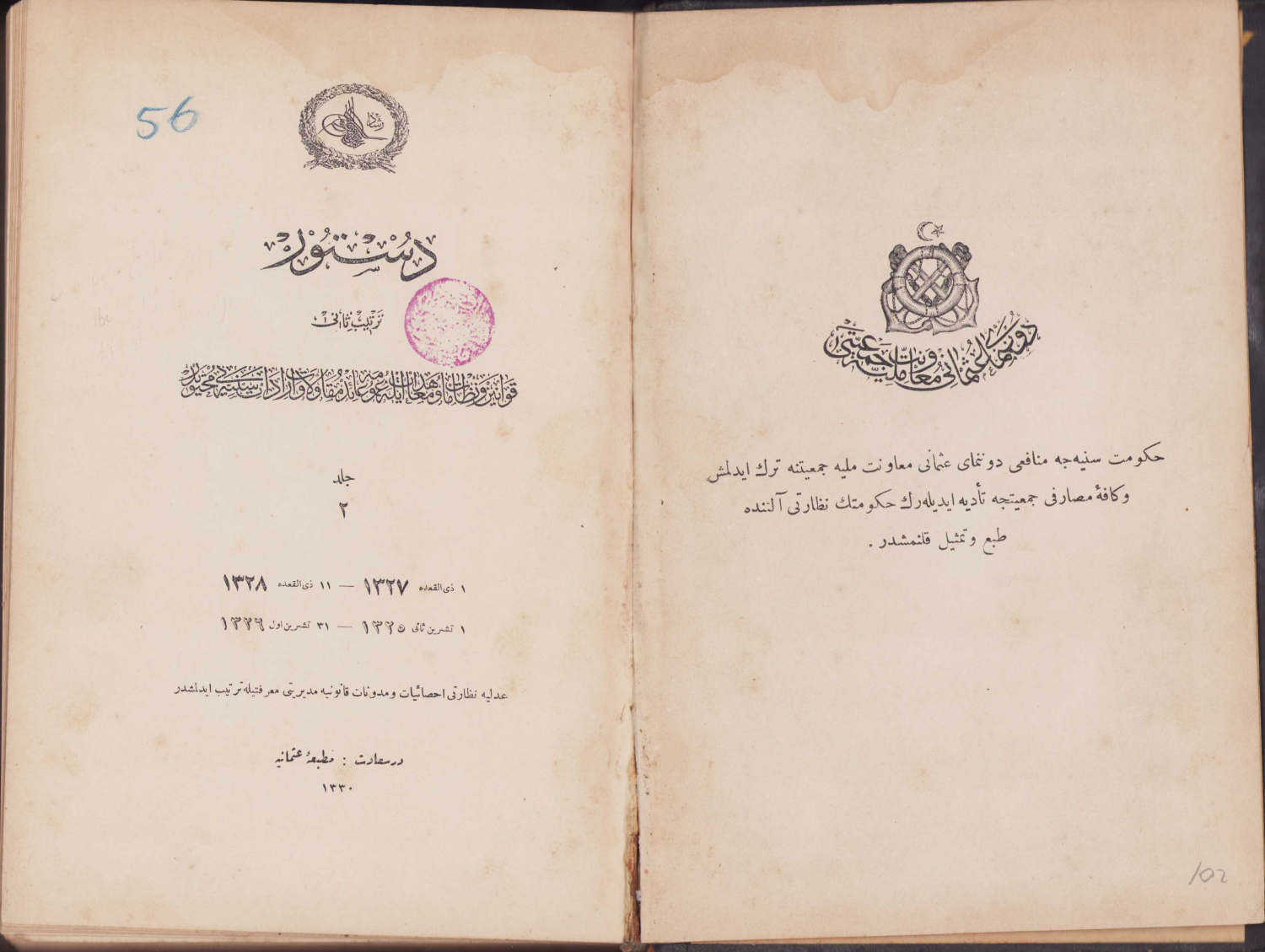 Donanmayı Muaveneti Osmaniye Cemiyeti - Düstur: Tertib-i Sani, cilt 2, Matbaa-i Osmaniye, İstanbul, 1330, Osmanlıca, içinde evrakı müsbete cetveli büyük boy yer almakta, deri cilt, 845 sayfa, 17x25cm