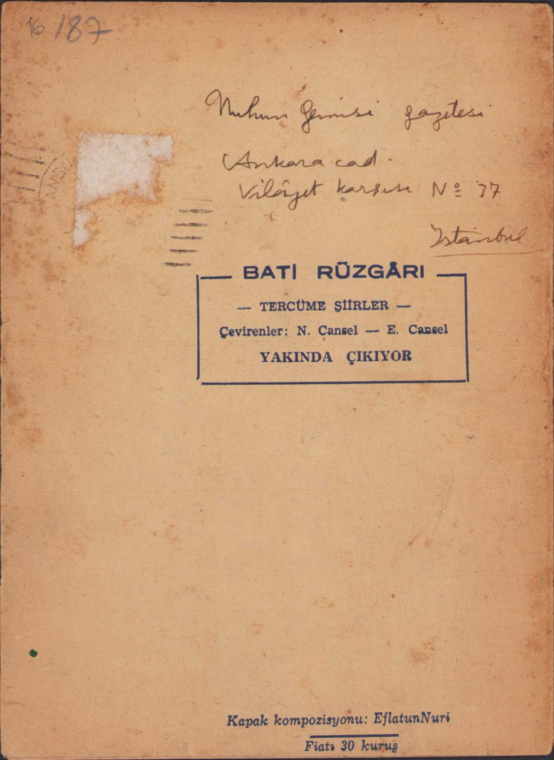 Fener Bekçisi - Şiirler, Nezih Cansel,Aksiseda Matbaası, Samsun, 1949, 16 sayfa, 14x20cm