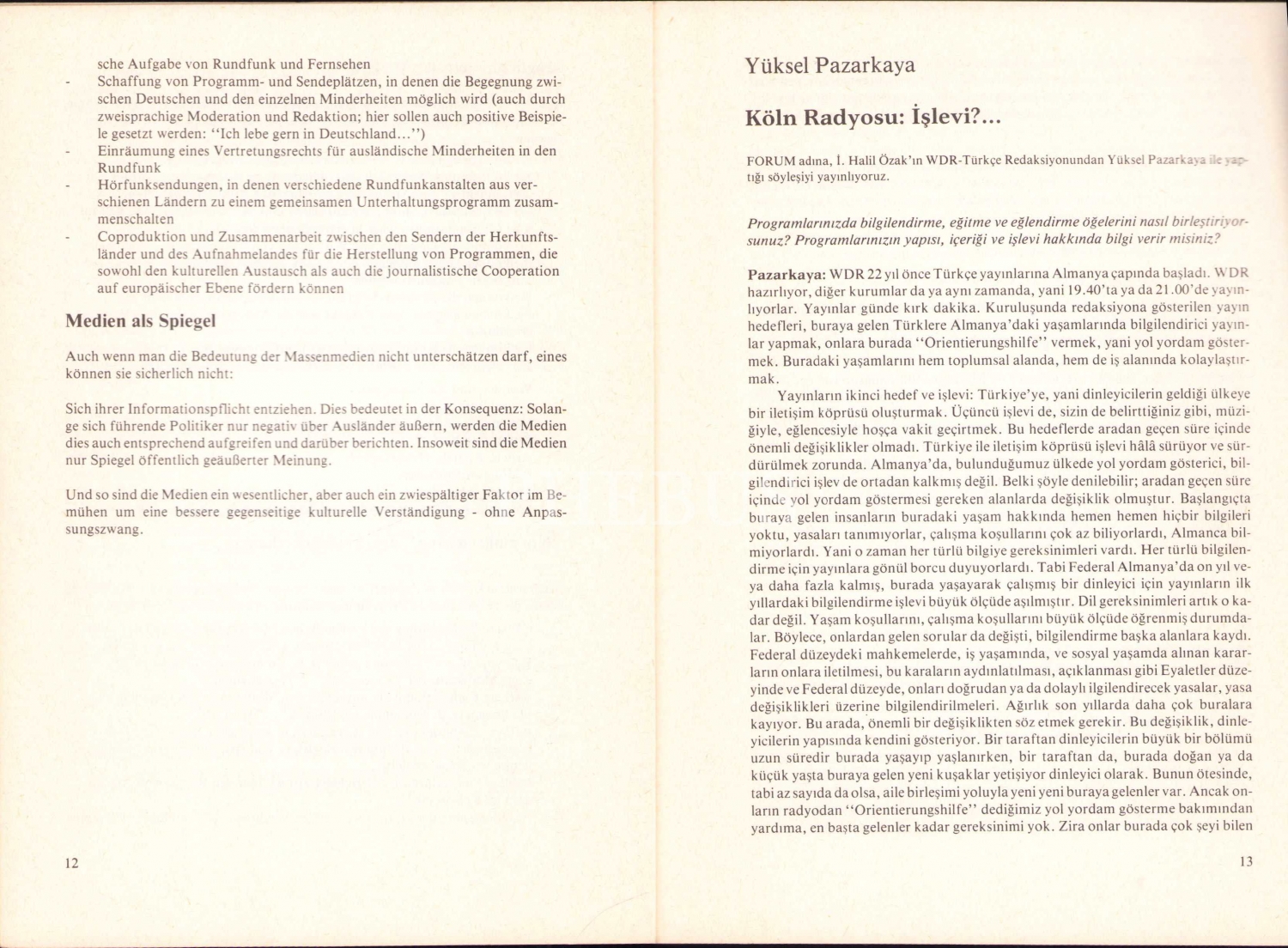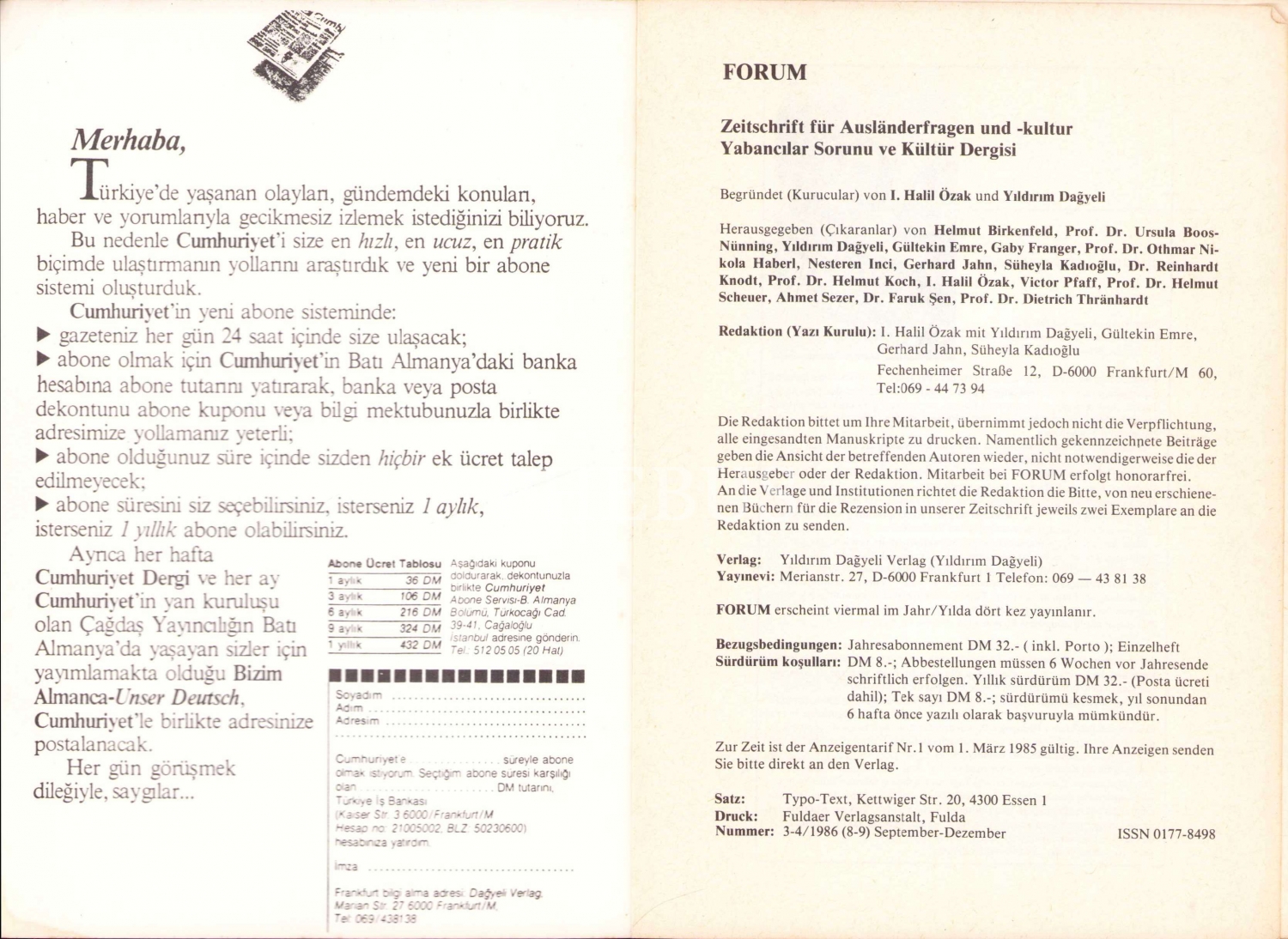 Almanca - Türkçe, Forum Zeitschrift für Aulandergragen und Kultur / Yabancılar Sorunu ve Kültürü Dergisi, 1986, 184 sayfa