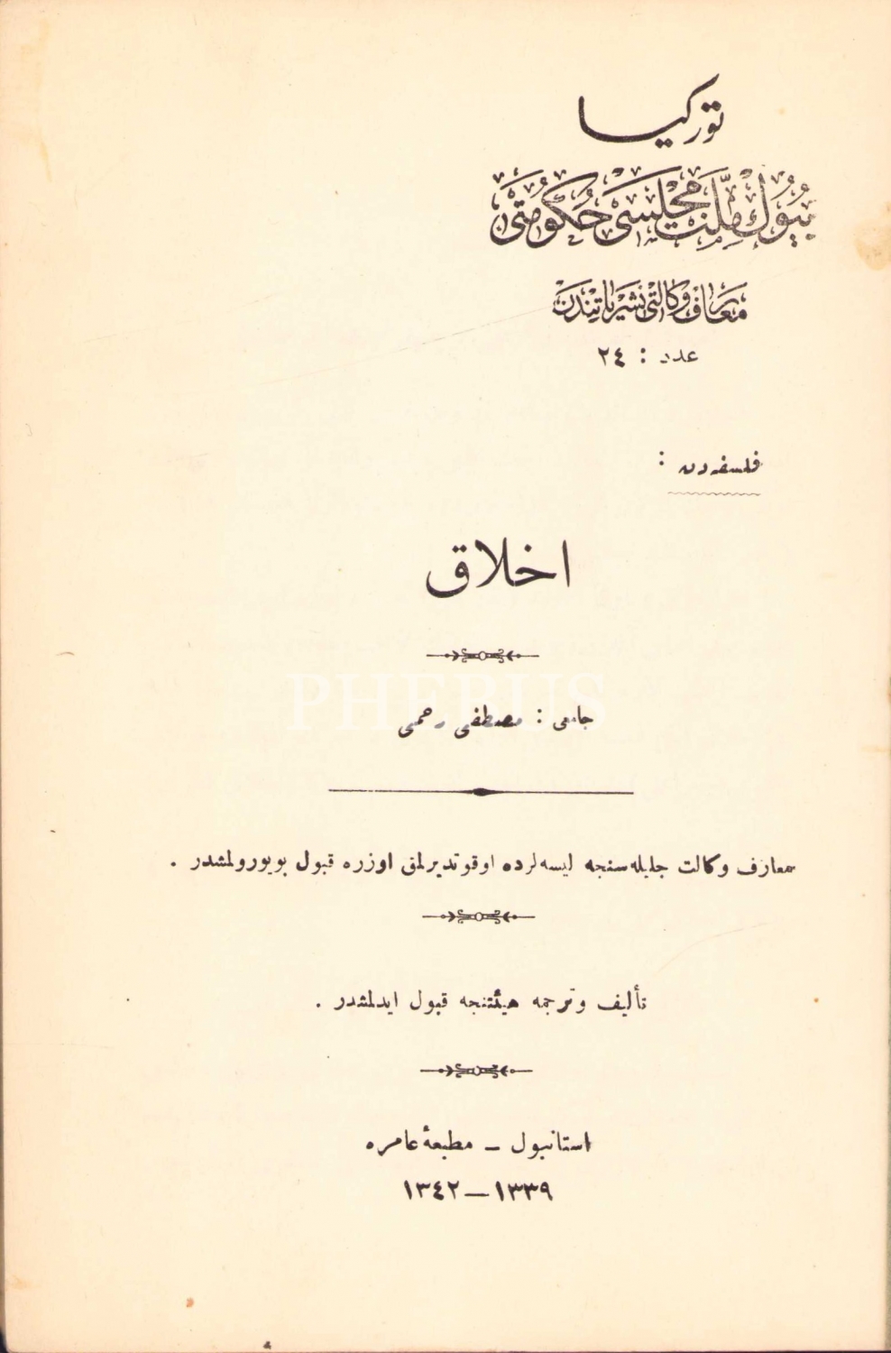 Osmanlıca, Ahlâk, Mustafa Rahmi [Balaban], 1342 Matbaa-i Âmire, 52+2 sayfa, ÖZEGE; 233, 24x14 cm