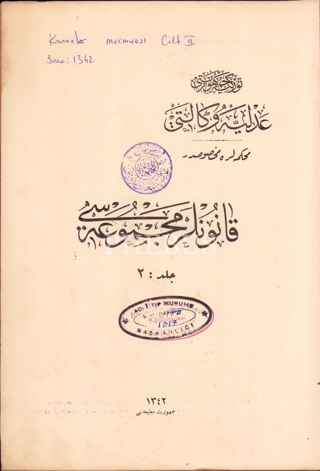 Osmanlıca, Kanunlar Mecmuası cild 2, 1342 Cumhuriyet Matbaası, 18+45+1173+171 sayfa, 20x28 cm, ÖZEGE; 24971, Cildi haliyledir
