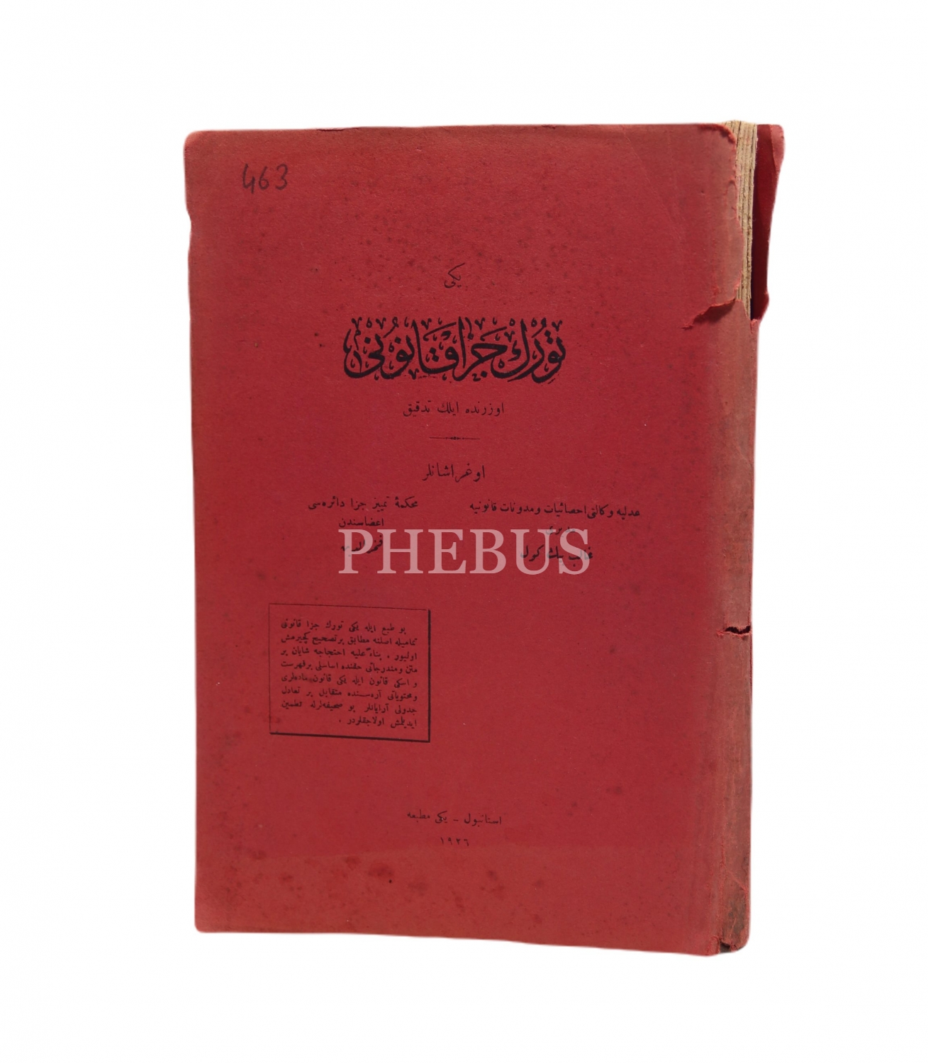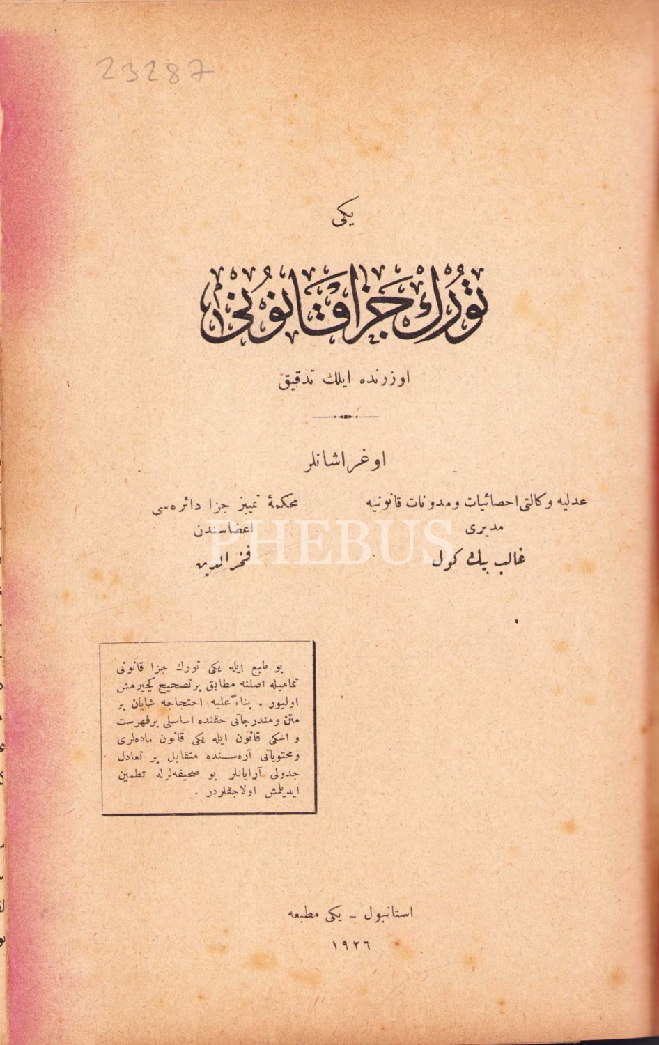Osmanlıca, Yeni Türk Ceza Kanunu Üzerinde İlk Tedkik, Galib [Bingöl], 1926 Yeni Matbaa, 248 sayfa, ÖZEGE; 23287