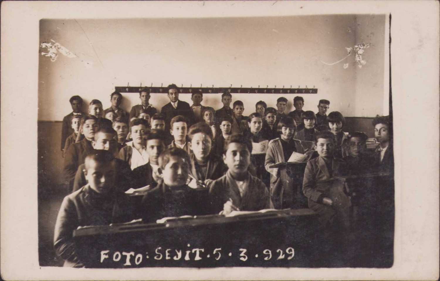 Mektepte öğretmen öğrencileriyle toplu hatıra fotoğrafında, 5 Mart 1929 tarihli, Foto Seyit