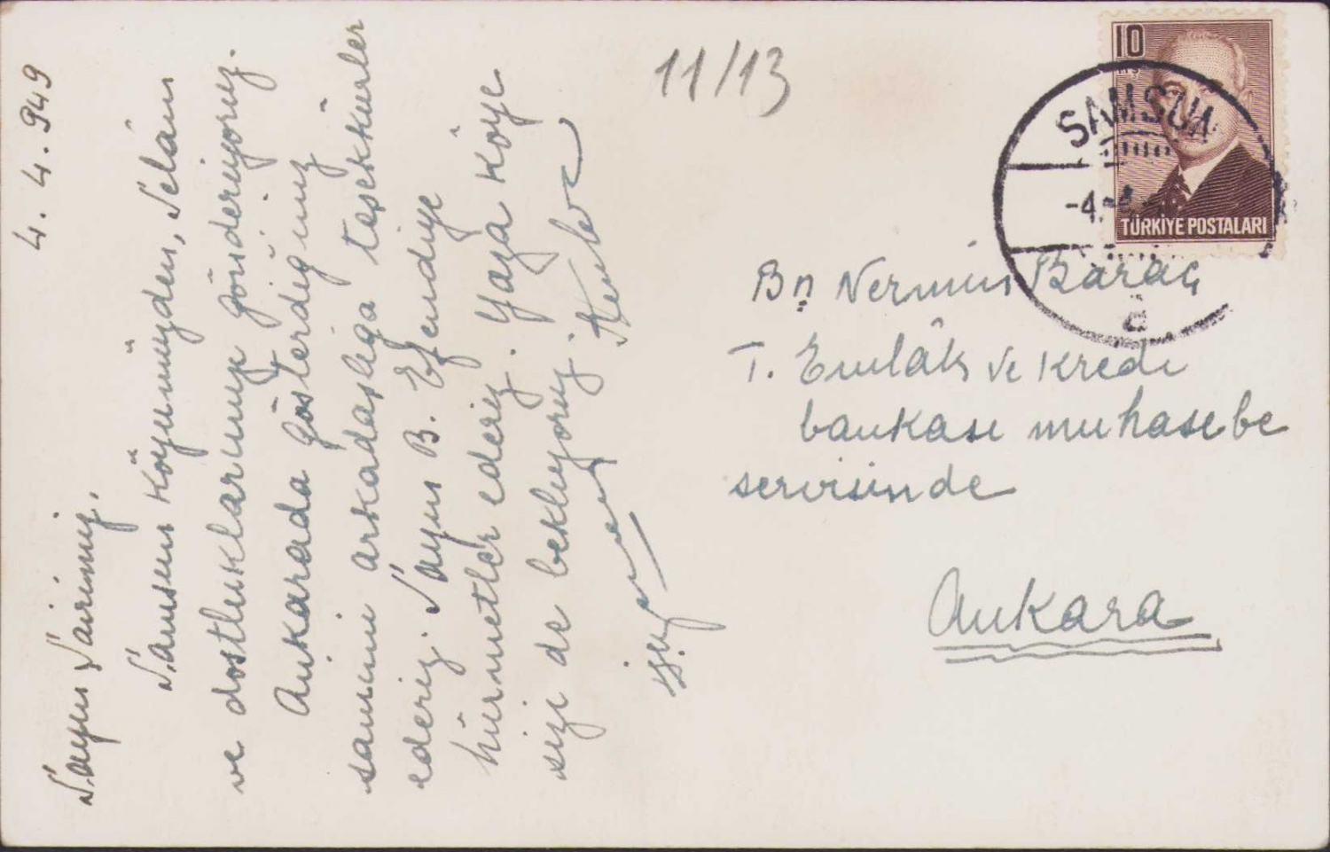 Samsun genel görünüm, 1949 tarihli, postadan geçmiş, pullu, damgalı, Ankara adresli